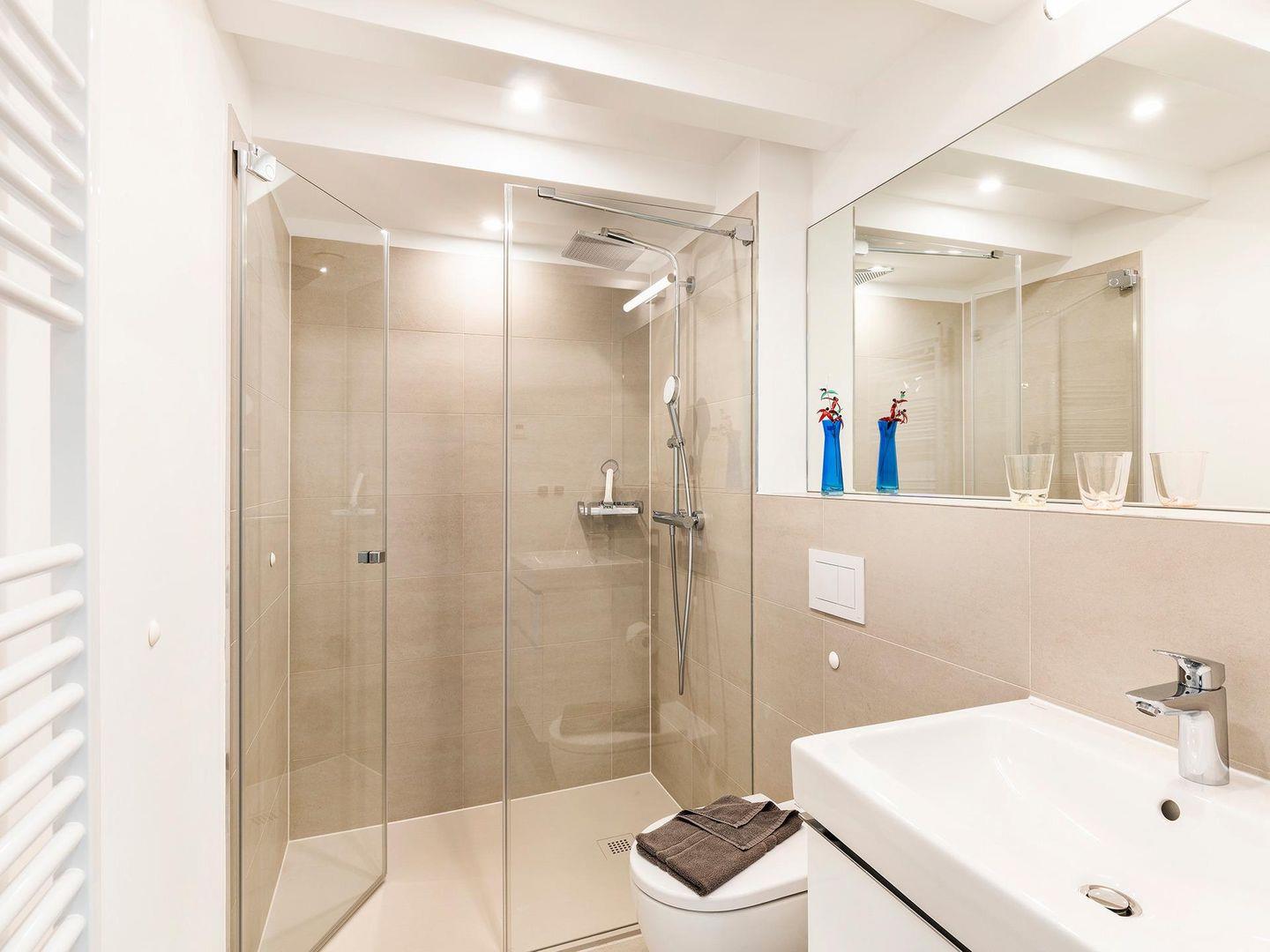 - Badezimmer 2: Regendusche, WC, Waschbecken, Handtuchheizung, Haartrockner, Kosmetikspiegel