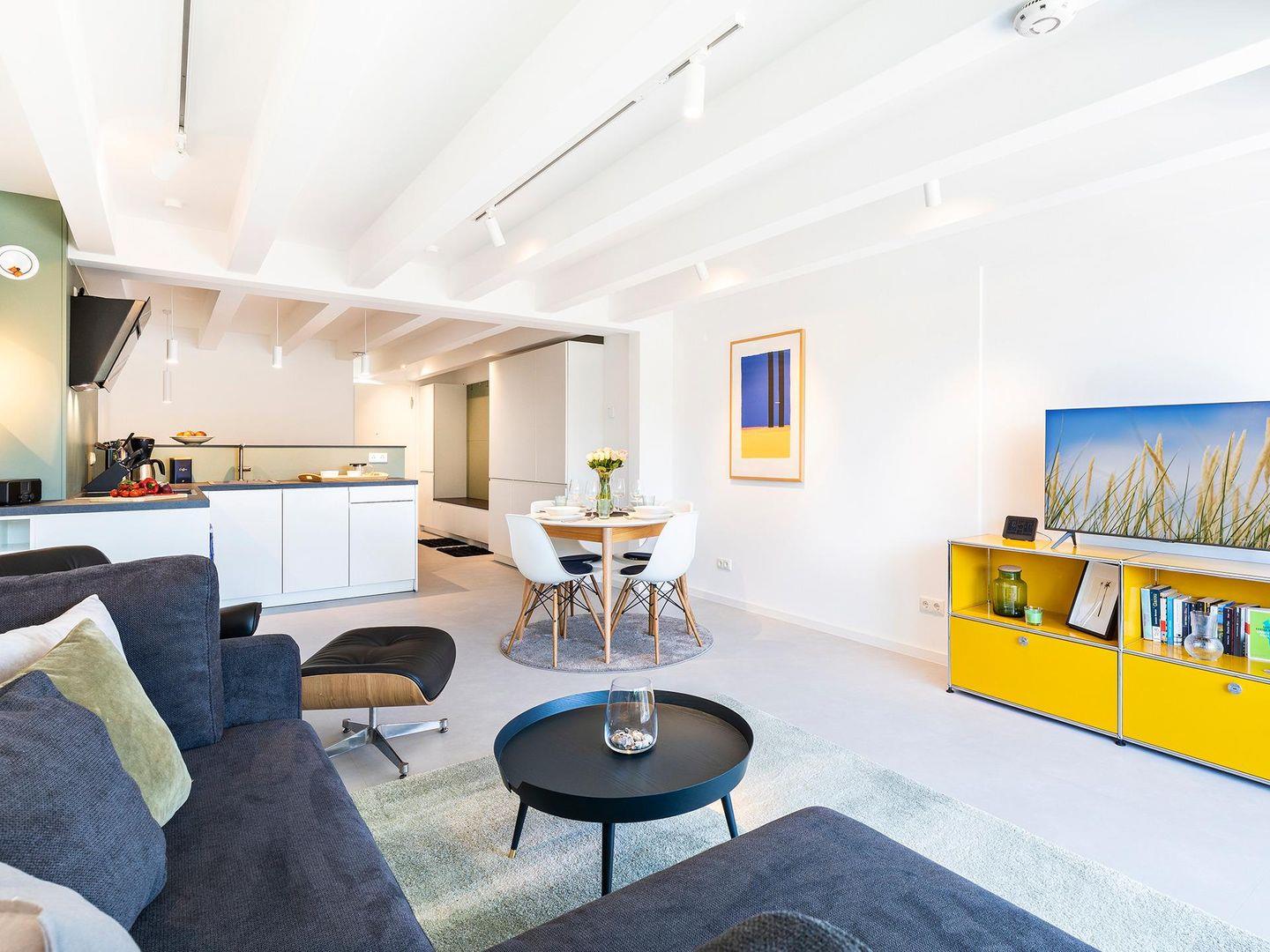 Auf fast 100 m² erwartet Sie diese moderne und stilvoll eingerichtete Maisonette-Wohnung mit zwei ausladenden und gemütlich gestalteten Terrassen. Wir wünschen Ihnen einen erholsamen und entspannten Aufenthalt in unserer Strandhafer.