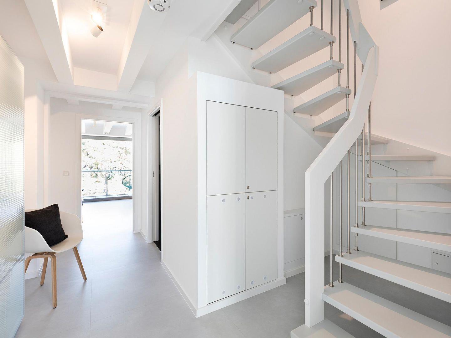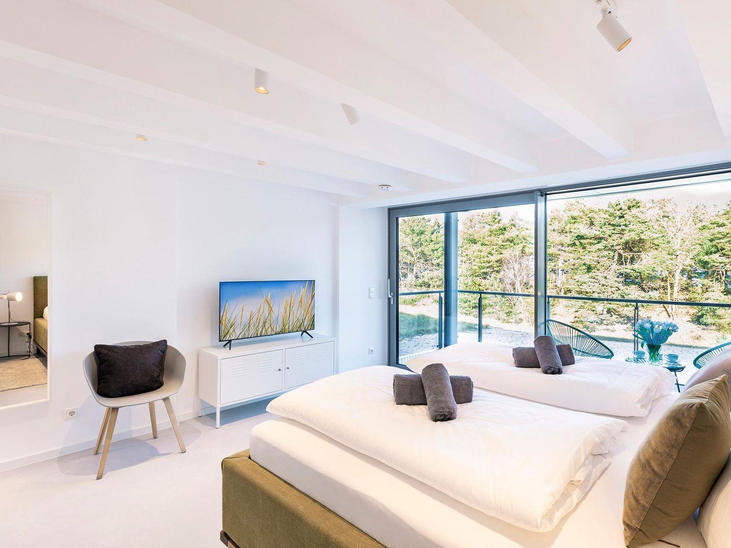 Getrennt vom Wohnbereich und verbunden durch eine breite Wendeltreppe befindet sich in der zweiten Etage der ruhige Schlafbereich mit zwei großen Schlafzimmern, einem weiteren Duschbad sowie einer zweiten Terrasse, auf der Sie dem Meeresrauschen lauschen und den Urlaubstag entspannt ausklingen lassen können.