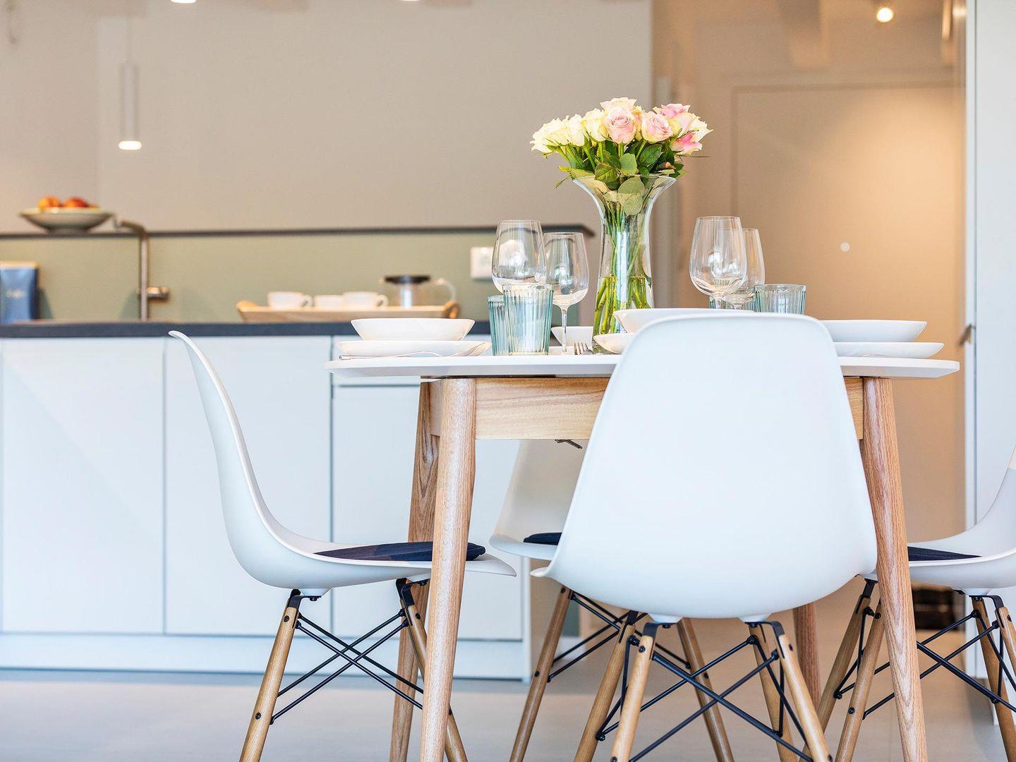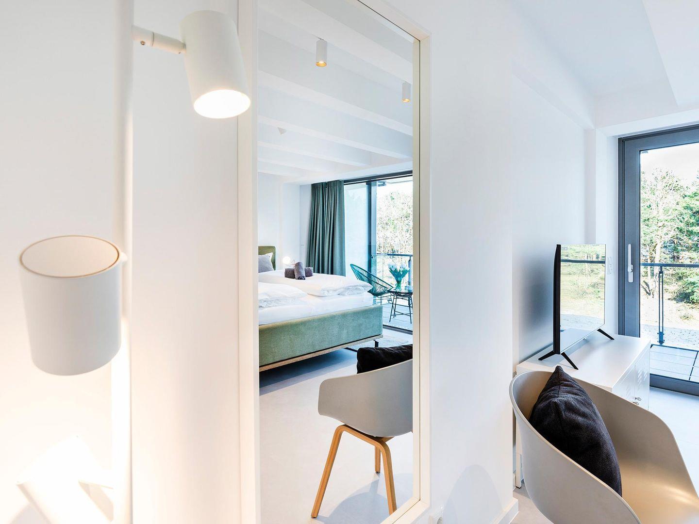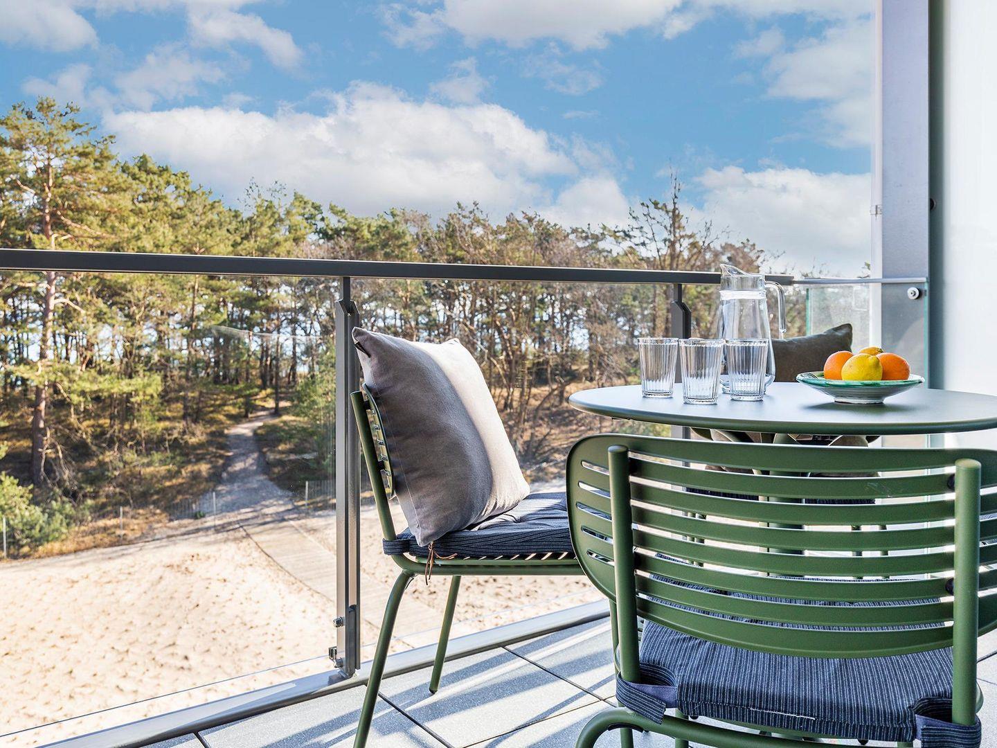 Der Eingang in der dritten Etage führt zu einem großzügigen offenen Wohn- und Essbereich mit einer voll ausgestatteten Einbauküche und zum ersten Duschbad, welches sich durch seine Lage im Eingangsbereich als sehr praktisch erweist, wenn man gerade vom Sonnenbad am Strand zurückkommt. Der wunderschöne Badestrand, der sich nur einige Meter entfernt vor der Ferienwohnung ausbreitet, zählt mit seinem feinen, weißen Sand und dem kristallklaren, blaugrünen Meer zu einem der schönsten Deutschlands und ist über den hauseigenen Zugang, über einen kurzen Weg durch ein Kiefernwäldchen, in wenigen Minuten zu erreichen. Nur Dünen, Strandhafer und Küstenwald liegen zwischen der Unterkunft und dem Meer, die Sicht bleibt ungetrübt von Asphalt und Fahrzeugen.