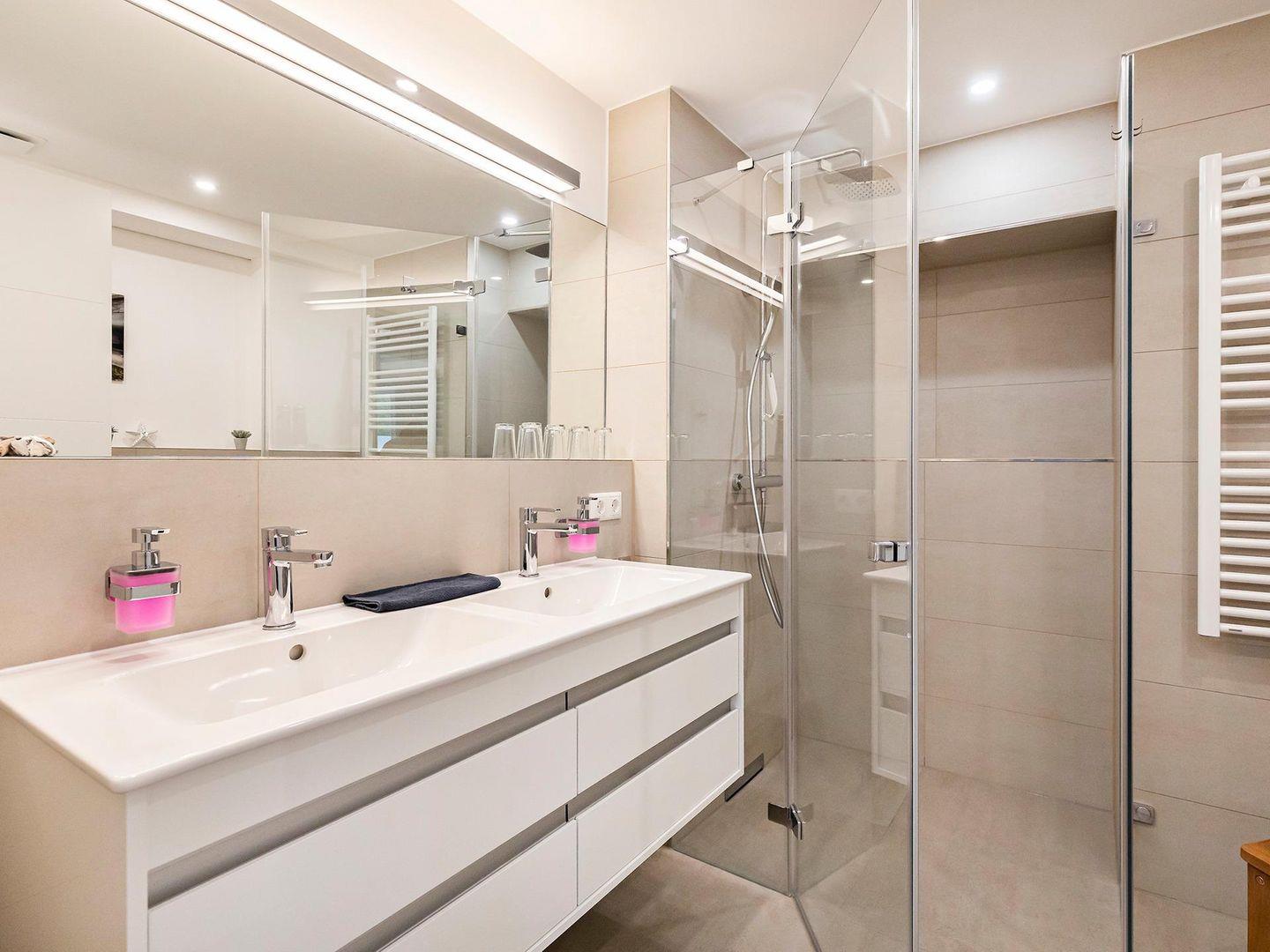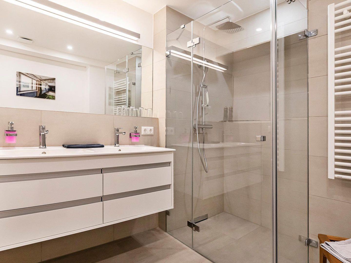 - Badezimmer 1: Regendusche, Doppelwaschbecken, WC und Föhn