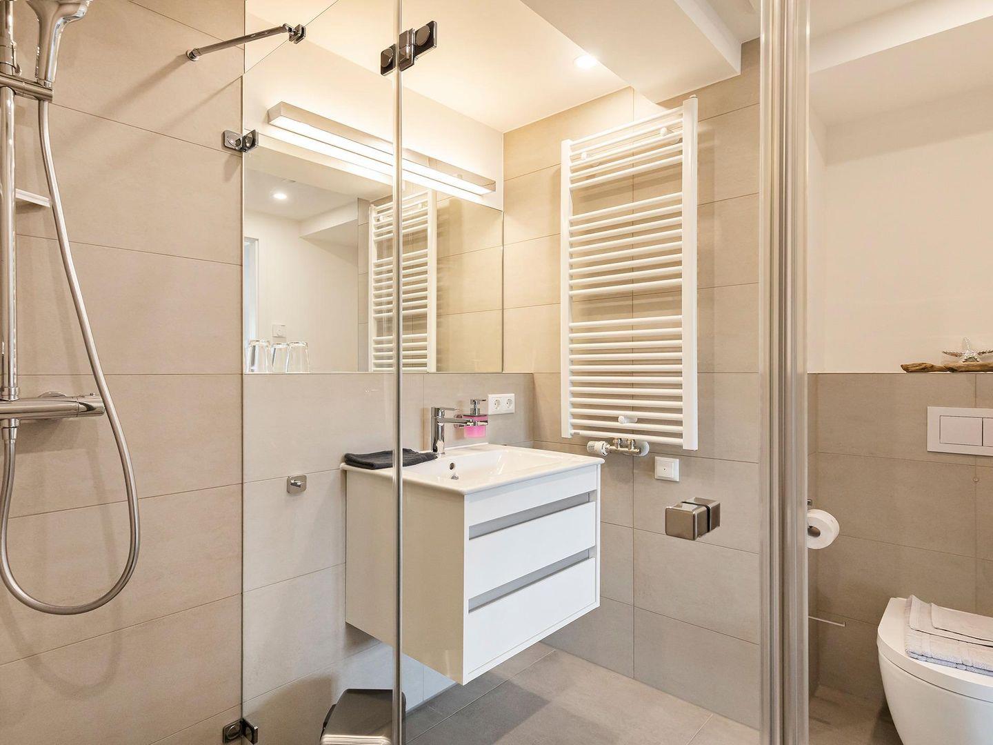 - Badezimmer 2: Regendusche, Waschbecken, WC und Föhn