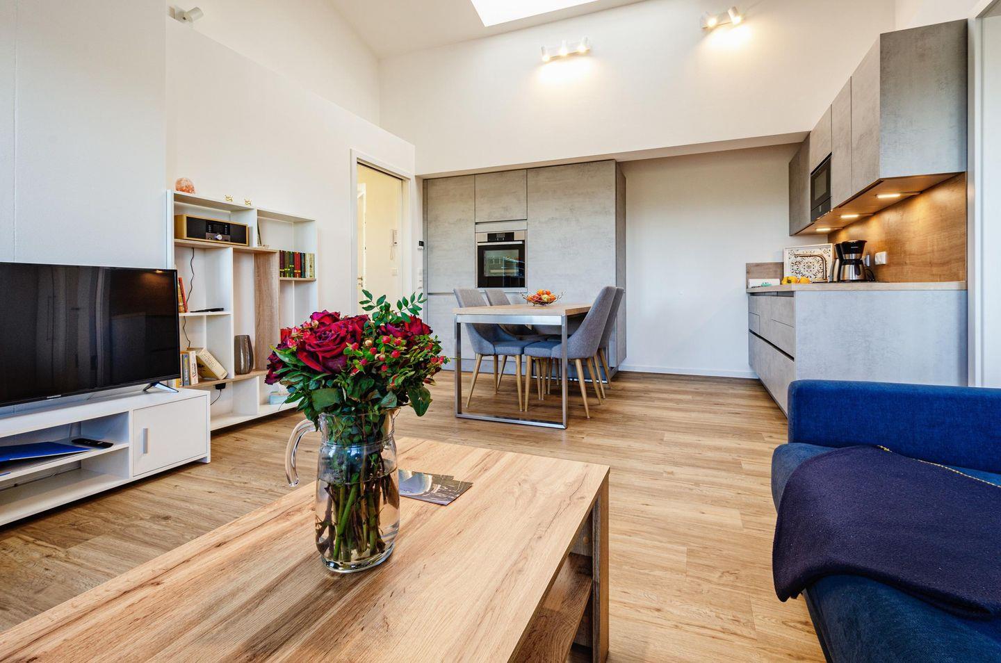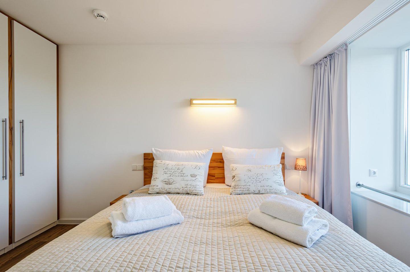Es ruft Sie in das Apartment "Meerestraum". Hier können Sie entspannen und den Alltagsstress abbauen. Dabei kann Ihnen bestimmt die Gemeinschaftssauna mit Dachterrasse helfen, welche sich mit Ihrem Apartment im höchsten Stockwerk des Hauses Arkona befindet und somit über den Flur erreichbar ist. Ein Buch über Prora oder ein Roman laden zum Entspannen auf dem Balkon ein, vielleicht mit einem Glas Wein oder einer Blütenmeerteemischung. Alternativ können Sie mit Netflix verregnete Stunden überbrücken oder mit dem Internetradio Musik aus aller Welt lauschen. Das Apartment bietet Platz für bis zu 4 Personen. Im Schlafbereich haben Sie den ungestörten Genuss von Ruhe und Entspannung, denn in dieser Zone ist Fernsehen und Elektrosmog tabu. Das angeschlossene Master-Badezimmer können Sie nur vom Schlafzimmer aus betreten. Im Kinderzimmer gibt es ein Etagendoppelstockbett, welches nach Bedarf oben und/oder unten ausgeklappt werden kann. Die Deckenlampe spendet nicht nur Licht in allen Farben des Regenbogens, sondern bietet über einen integrierten Bluetooth-Lautsprecher auch den Sound für kindlichen Zeitvertreib. Das zweite Duschbad liegt gleich neben dem Kinderzimmer und ist ein kleines Raumwunder. In der Küche werden Sie eine laute Dunstabzugshaube vergeblich suchen. Den geruchfreien Spaß beim Kochen gewährleistet ein in das große Induktionskochfeld eingelassener Muldenlüfter. Für unsere kleinen Gäste sind alle Steckdosen im unteren Bereich gesichert.
