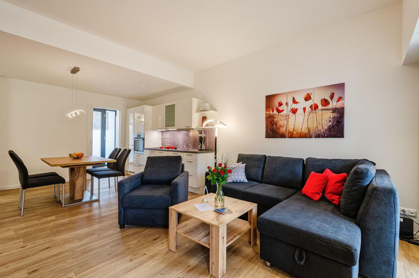 - Wohnzimmer: Schlafsofa, TV (Netflix mit eigenen Zugangsdaten möglich),Zugang zur Terrasse