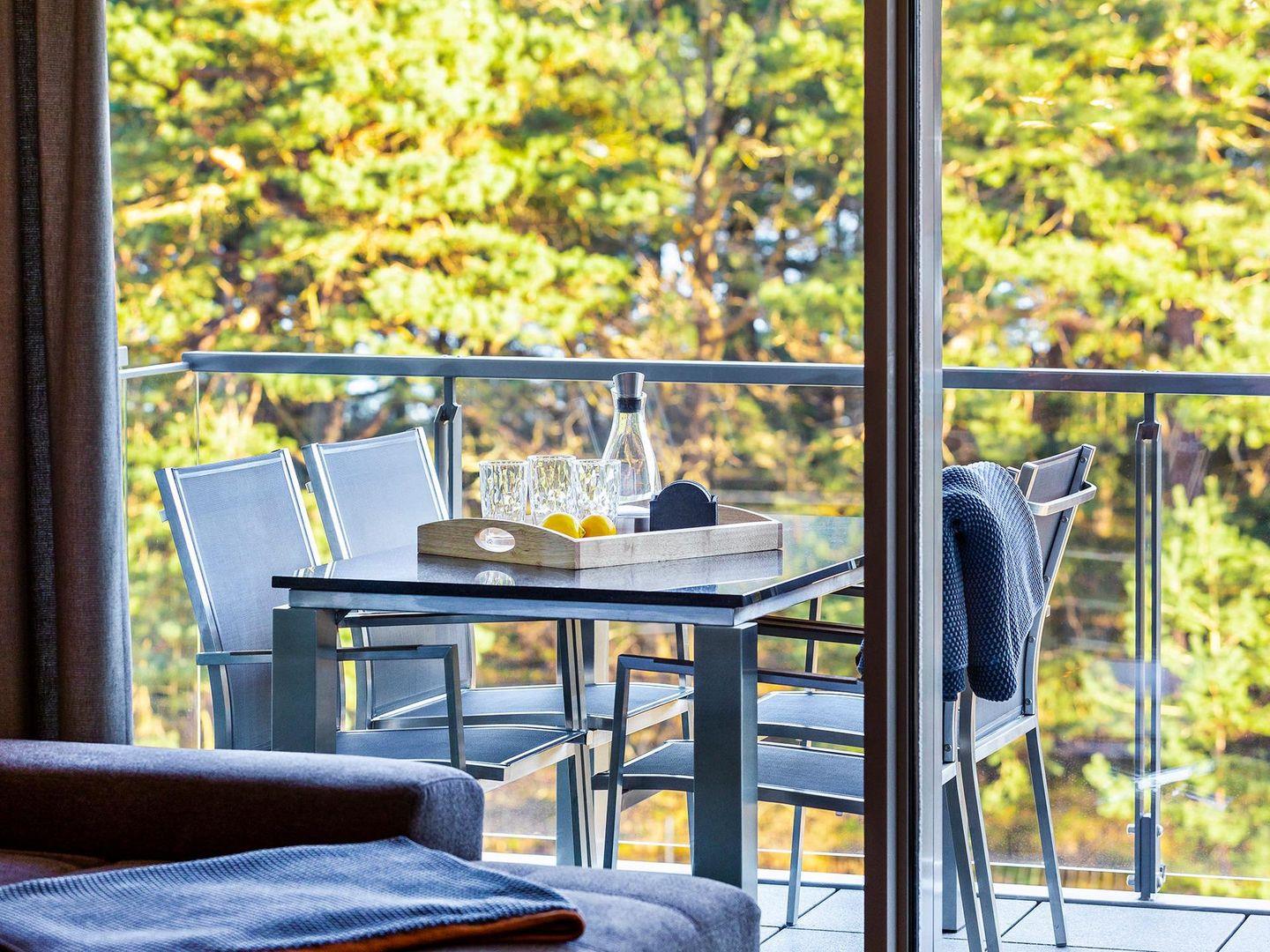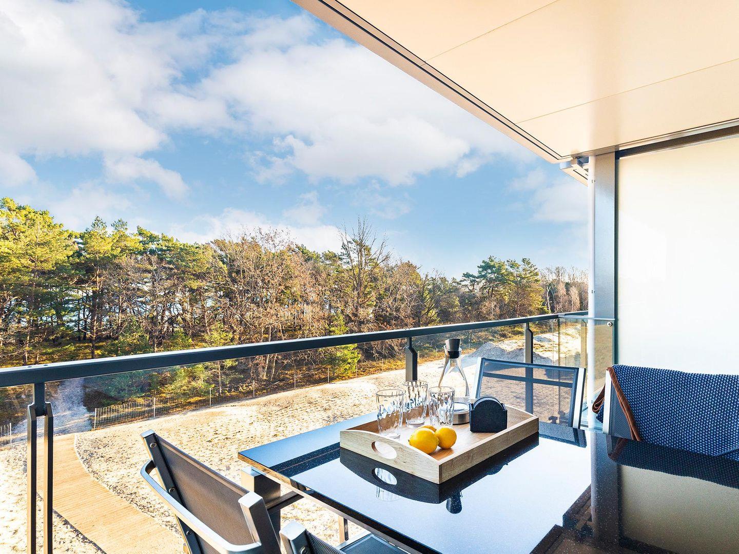 Sie verfügt gleich über 2 Balkone, auf denen Sie morgens den Sonnenaufgang, im hauseigenen Strandkorb, direkt über der Ostsee, genießen können.