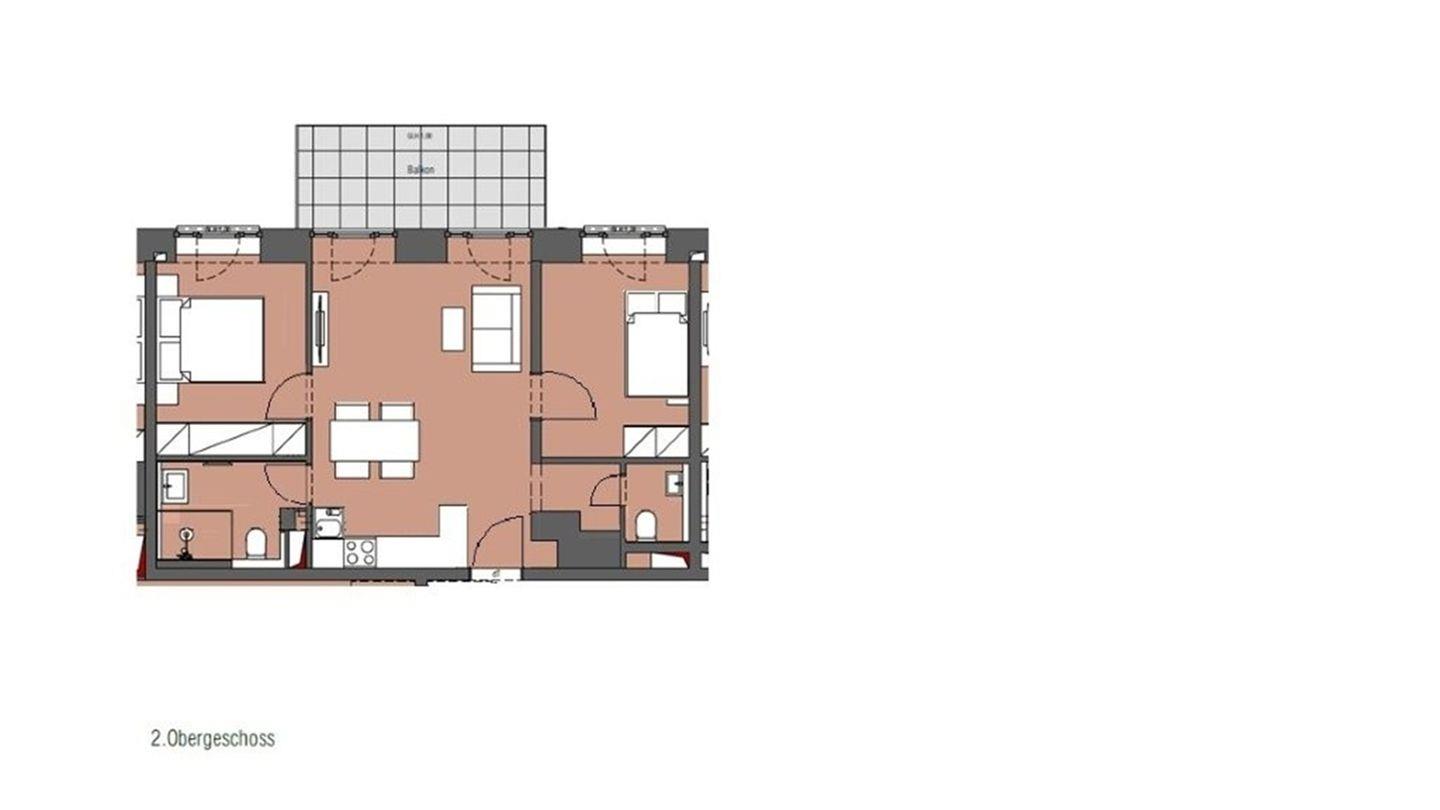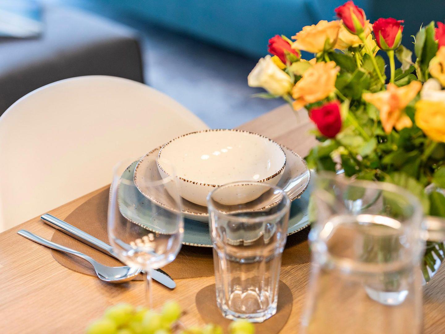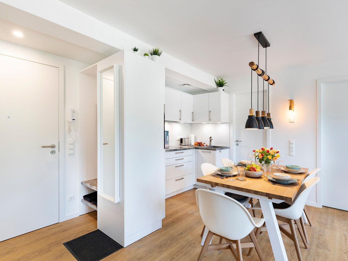 - Wohn-/Essbereich: Sitzgruppe mit Couch und Sessel, Smart-TV, Zugang zum Balkon, Esstisch mit 5 Stühlen