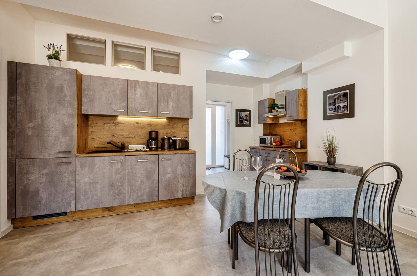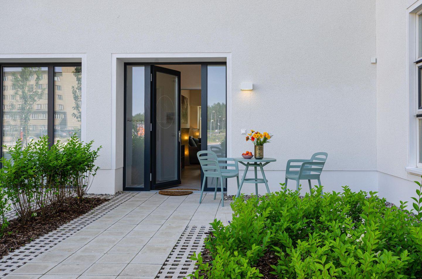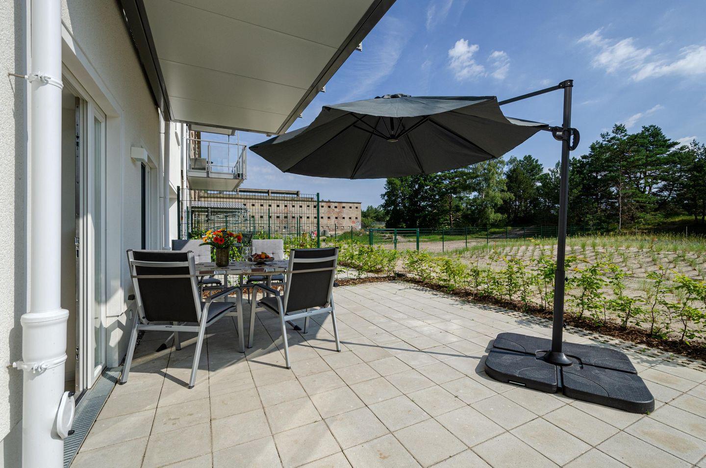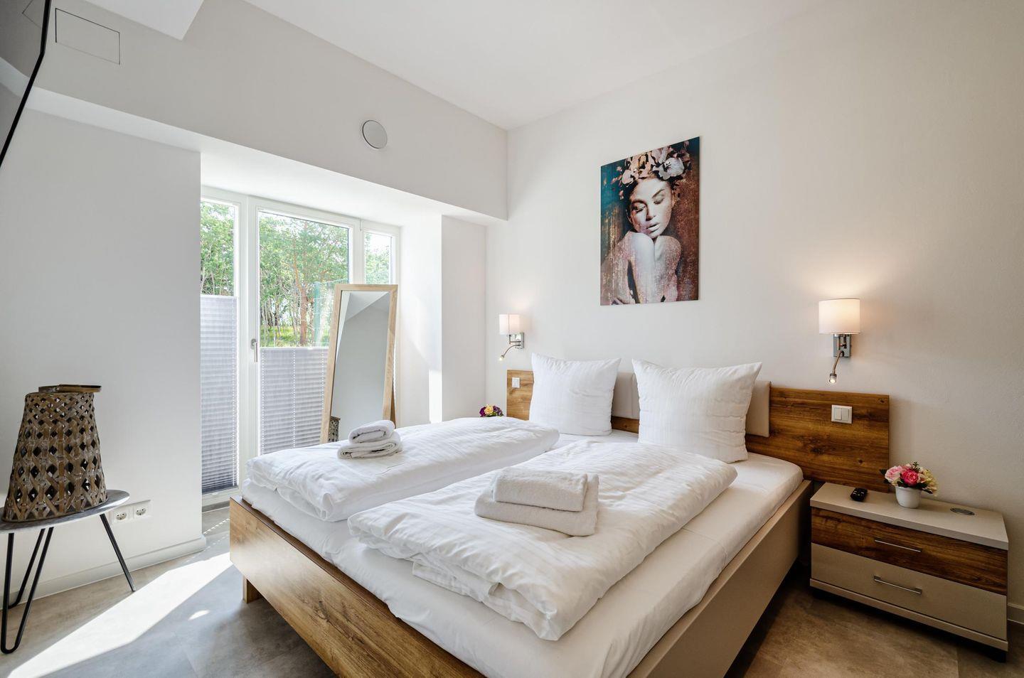 Dieses Erdgeschoß-Apartment lädt zum Verweilen ein, sein Schnitt und seine Einrichtung ? altersgerecht und modern ? zum Wohlfühlen. Mit zwei Schlafzimmern und einem geräumigen Wohn- und Essbereich bietet diese Wohnung für bis zu 4 Personen ausreichend Platz. Der Vorteil des großen Schlafzimmers ist sein direkter Zugang zur Terrasse, das andere Zimmer ist mit einem bequemen und hohem Einzelbett ausgestattet und somit auch für Menschen, die altersgerechte Hilfsmittel (wie Rollstühle) benutzen, sehr geeignet. (Das Bett lässt sich ausziehen und schafft somit die Schlafmöglichkeit für eine zweite Person.)