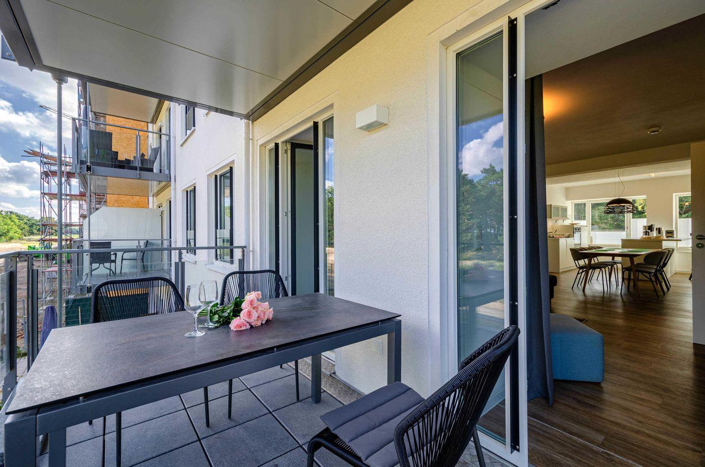 - Balkon mit Sitzmöglichkeit und Blick auf Dünen und Küstenwald