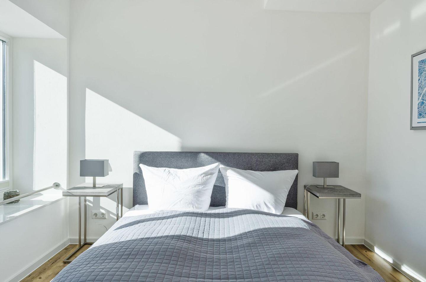 - Schlafzimmer 1: Doppelbett (160 x 200), TV, Zugang zum Balkon