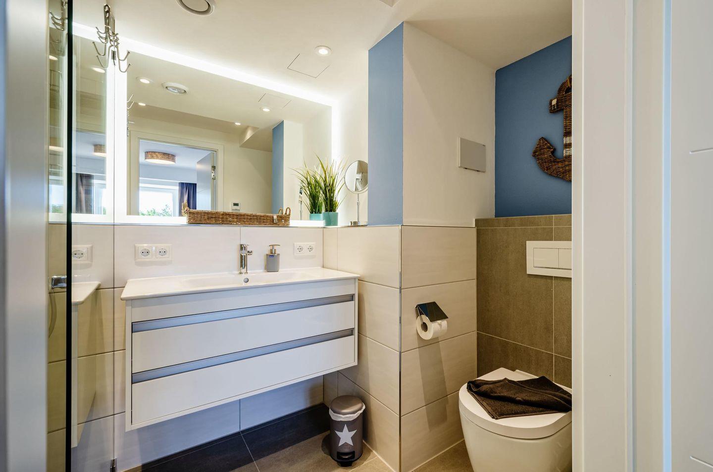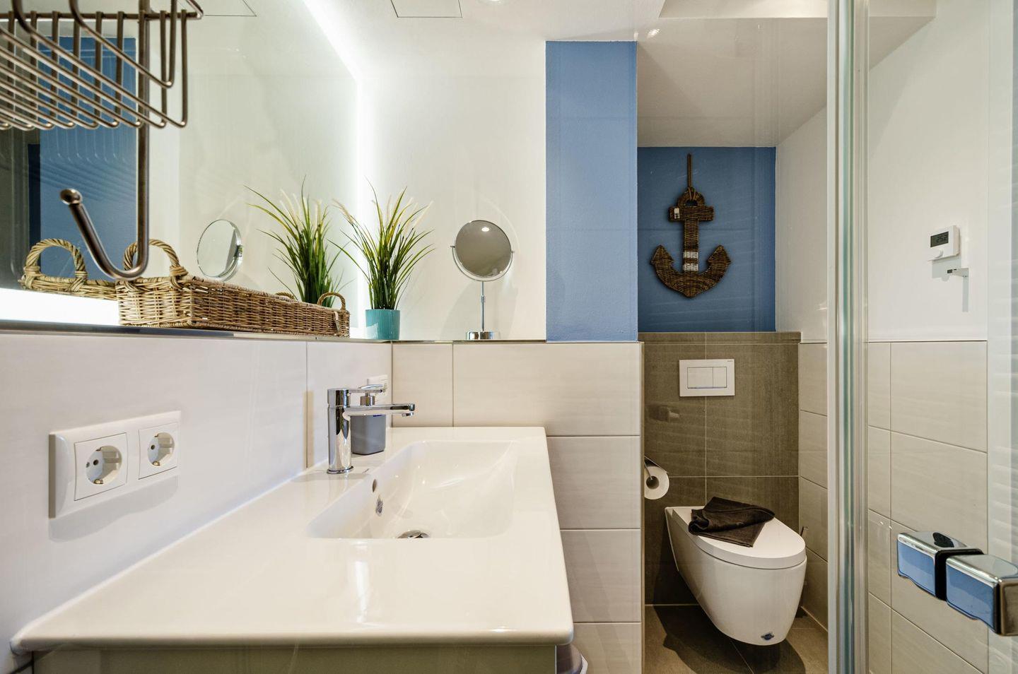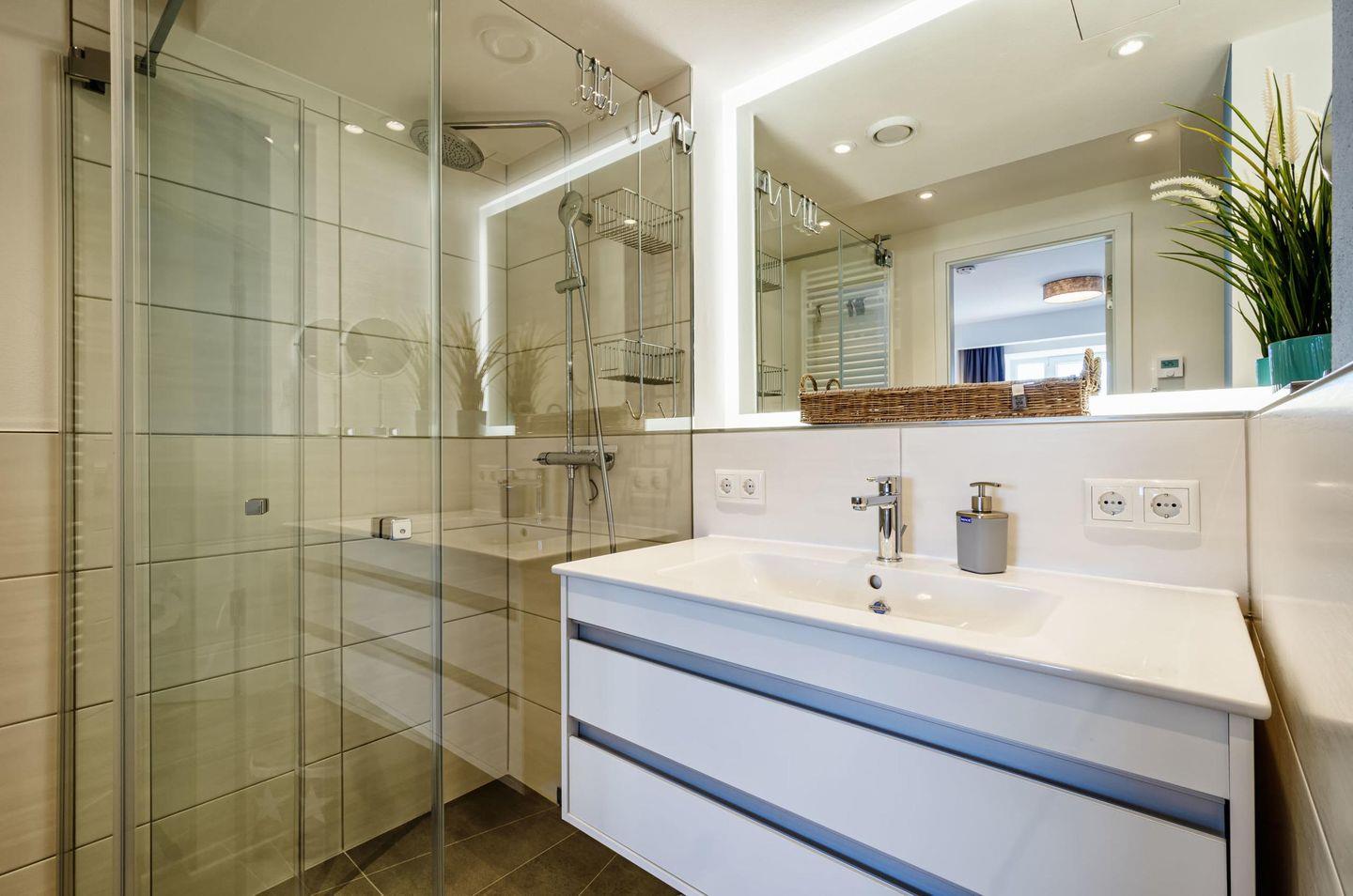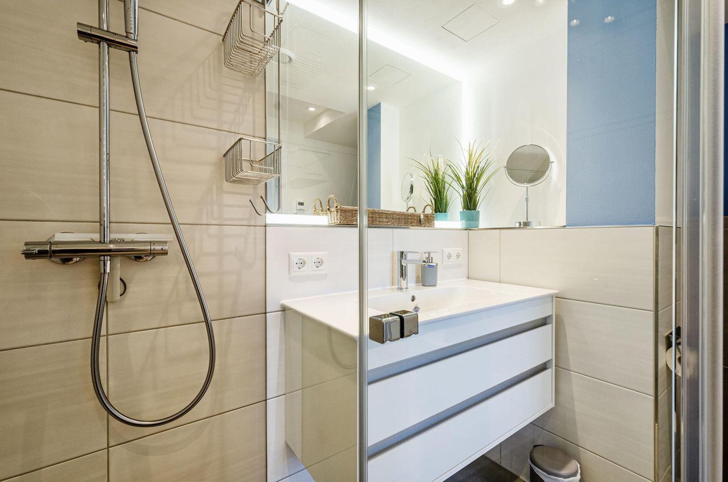 Im Badezimmer ist eine ebenerdige Dusche, ein elektrisch beheizbarer Handtuchhalter, ein Waschtisch, Toilette, sowie ein Föhn.