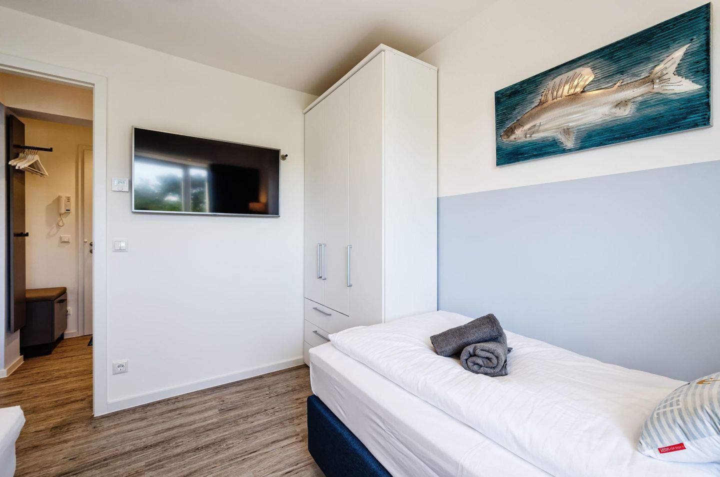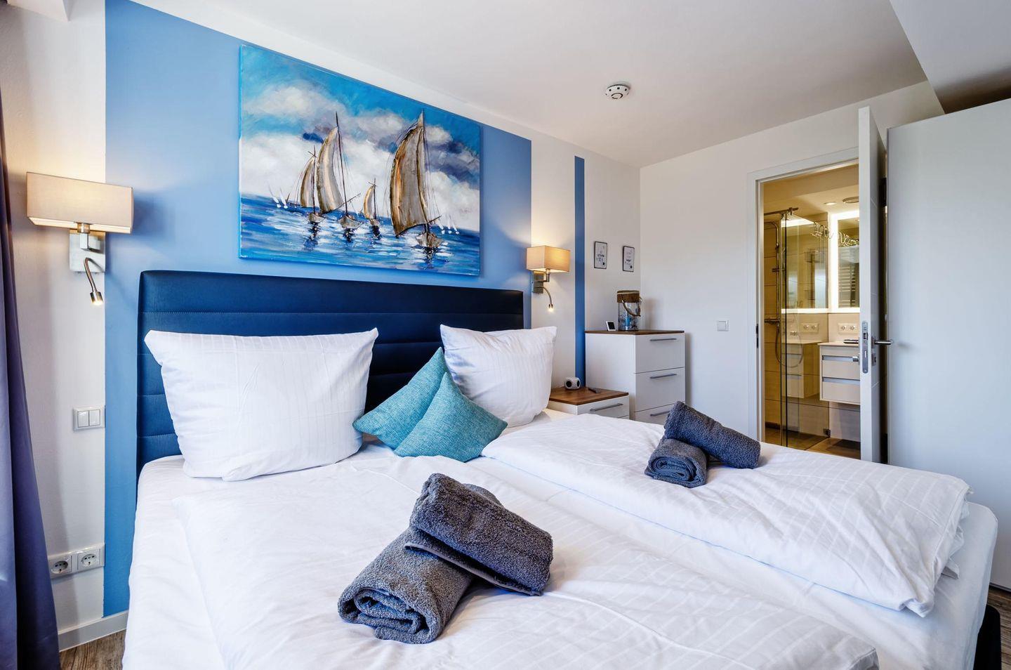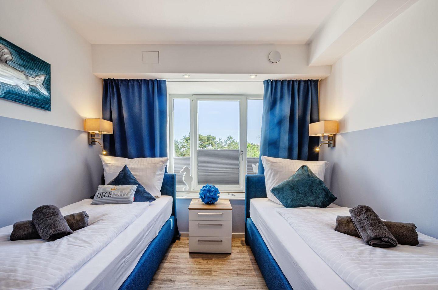 Beide Schlafzimmer sind mit einem Smart-TV, Verdunklungsplissees und einem Kleiderschrank ausgestattet. Im großen Schlafzimmer befindet sich ein Boxspringbett (180 x 200 m) und im zweiten Schlafzimmer stehen zwei weitere Boxspringbetten (90 x 200 m).