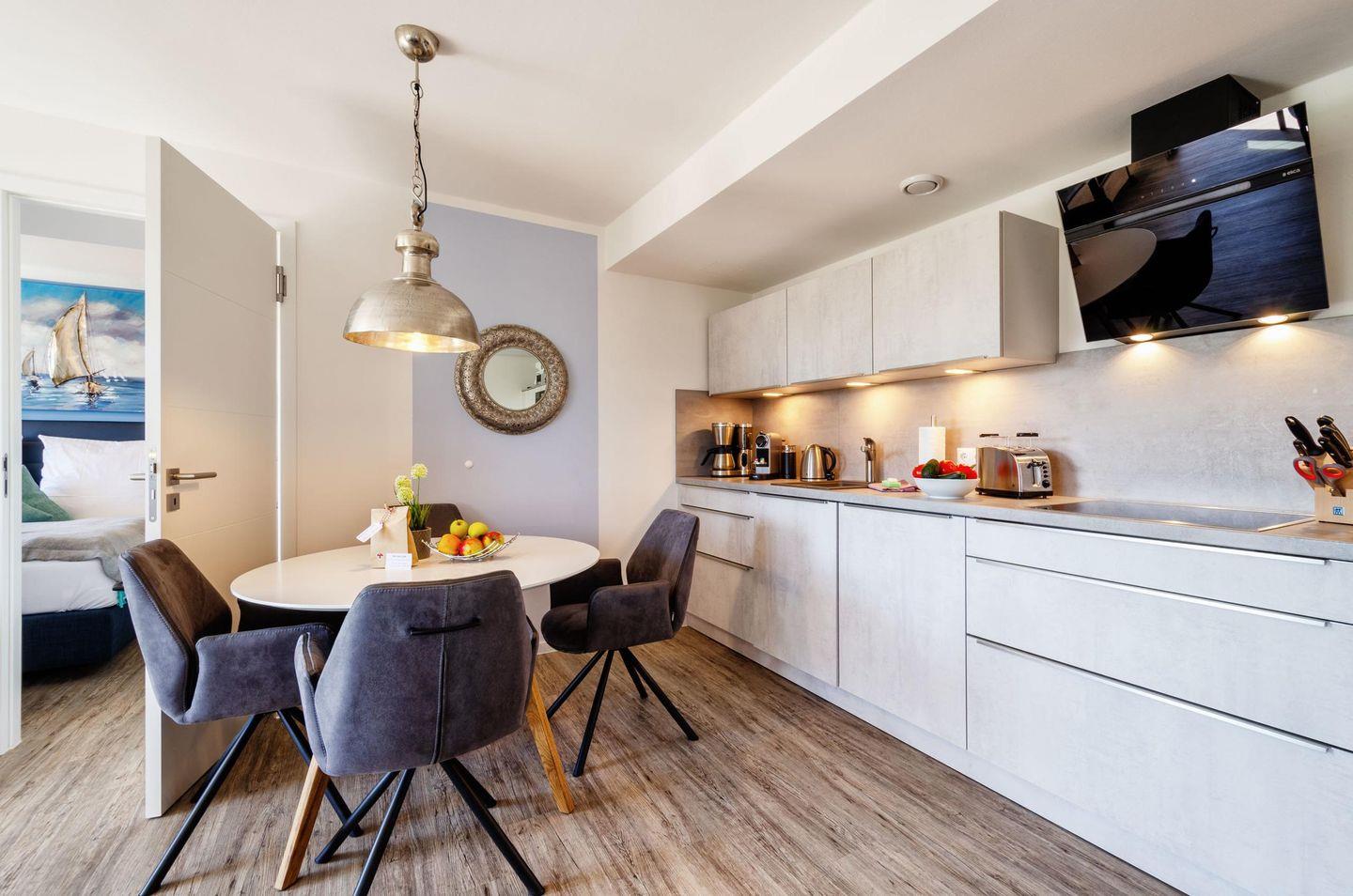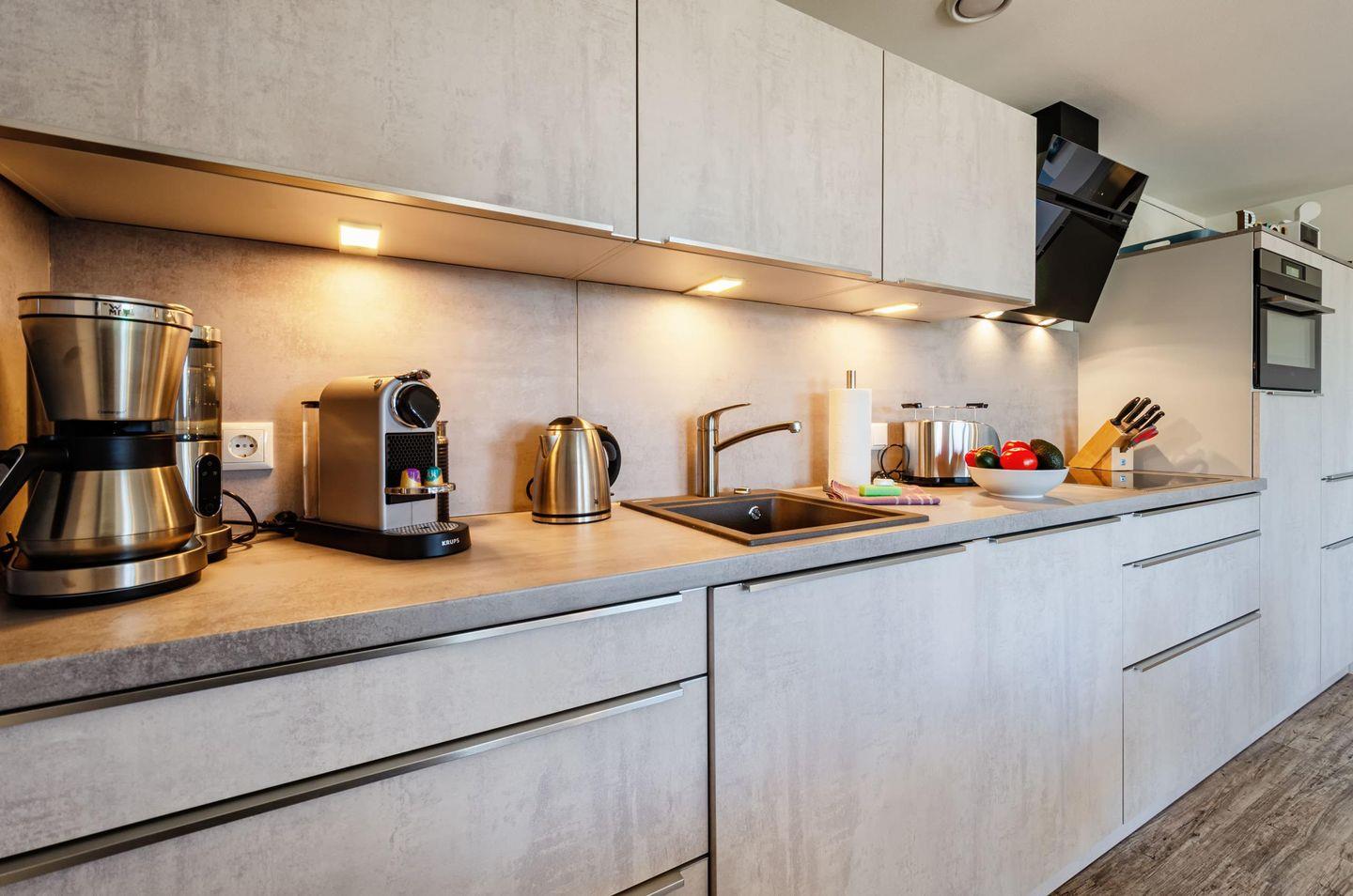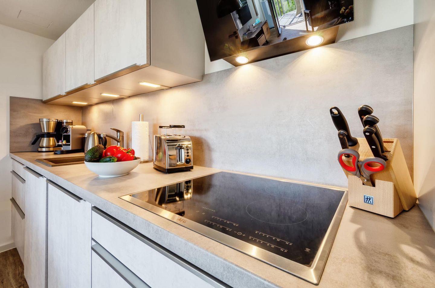 Die moderne vollausgestattete Einbauküche verfügt über einen Backofen mit Mikrowelle, Nespressomaschine, Kaffeemaschine, 4-Platten-Induktionskochfeld, Wasserkocher, Kühlschrank mit Tiefkühlfach, Toaster, Mixer, Küchenwaage und Auflaufformen.