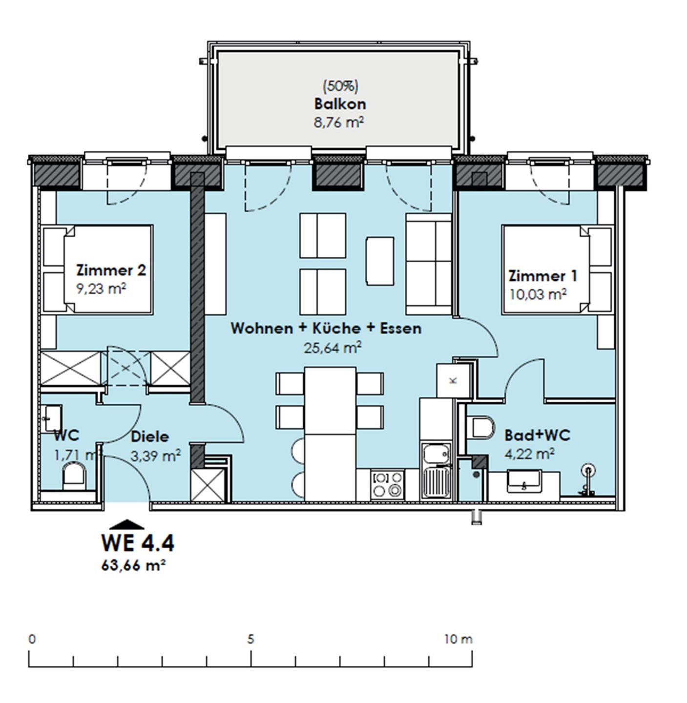 - Wohnzimmer: Sofa, TV, Essbereich, Zugang zum Balkon