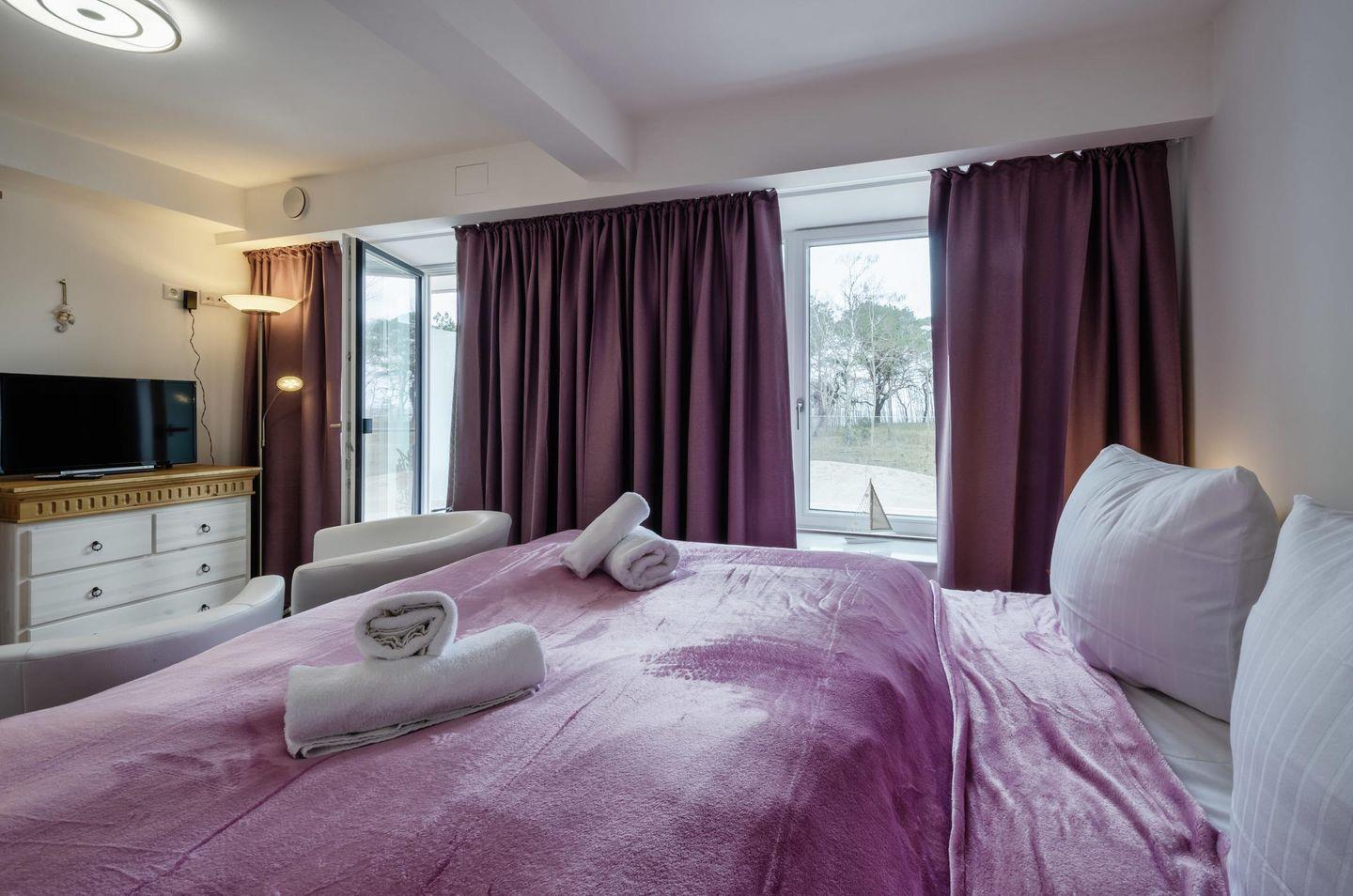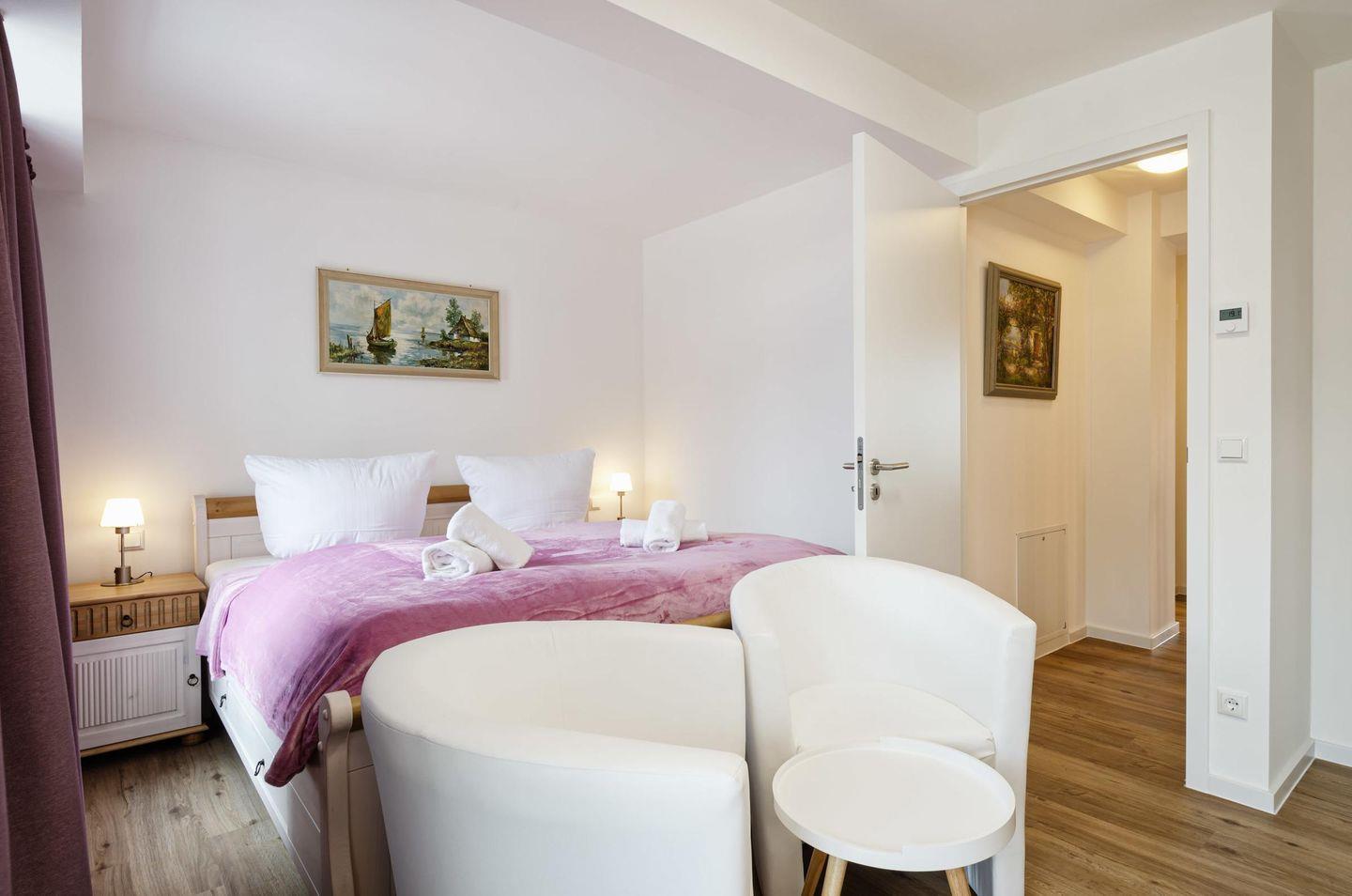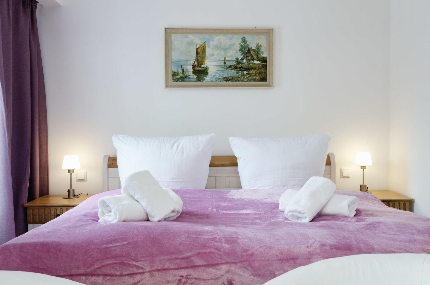 - Schlafzimmer 1: Doppelbett (160x200), TV, Zugang zum Balkon, Seeseite