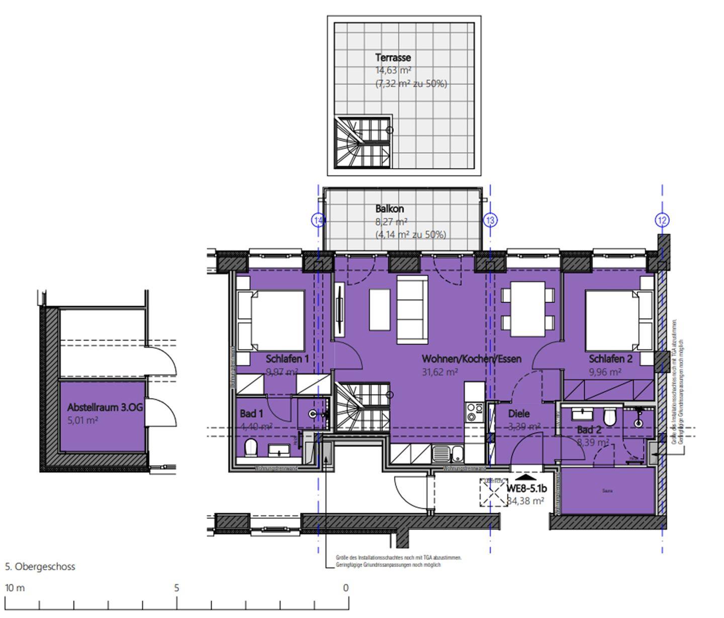 Gleich zwei moderne Badezimmer sorgen dafür, dass Sie stressfrei entspannen, saunieren und danach Ihre Regendusche genießen können. Parken können Sie vor dem Haus auf dem hauseigenen Parkplatz und gelangen mit dem Aufzug bequem in die fünfte Etage.