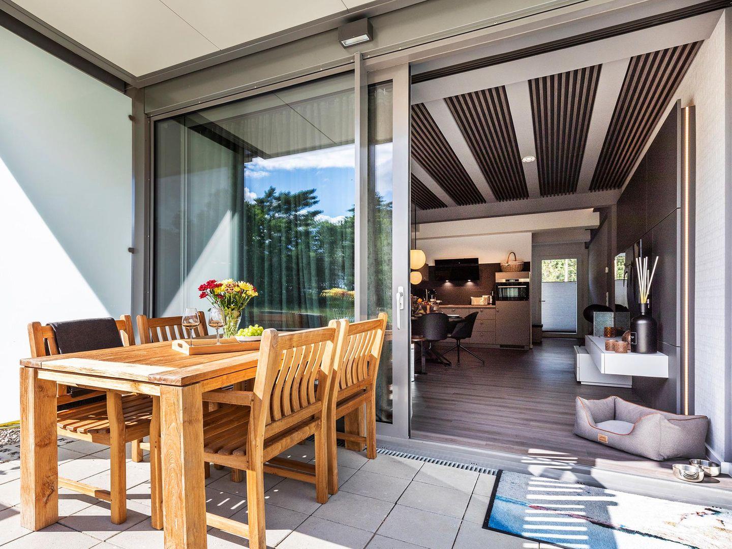 - Wohn/Essbereich: Sofa, Sitzbereich, Essbereich, TV, Zugang zur Terrasse