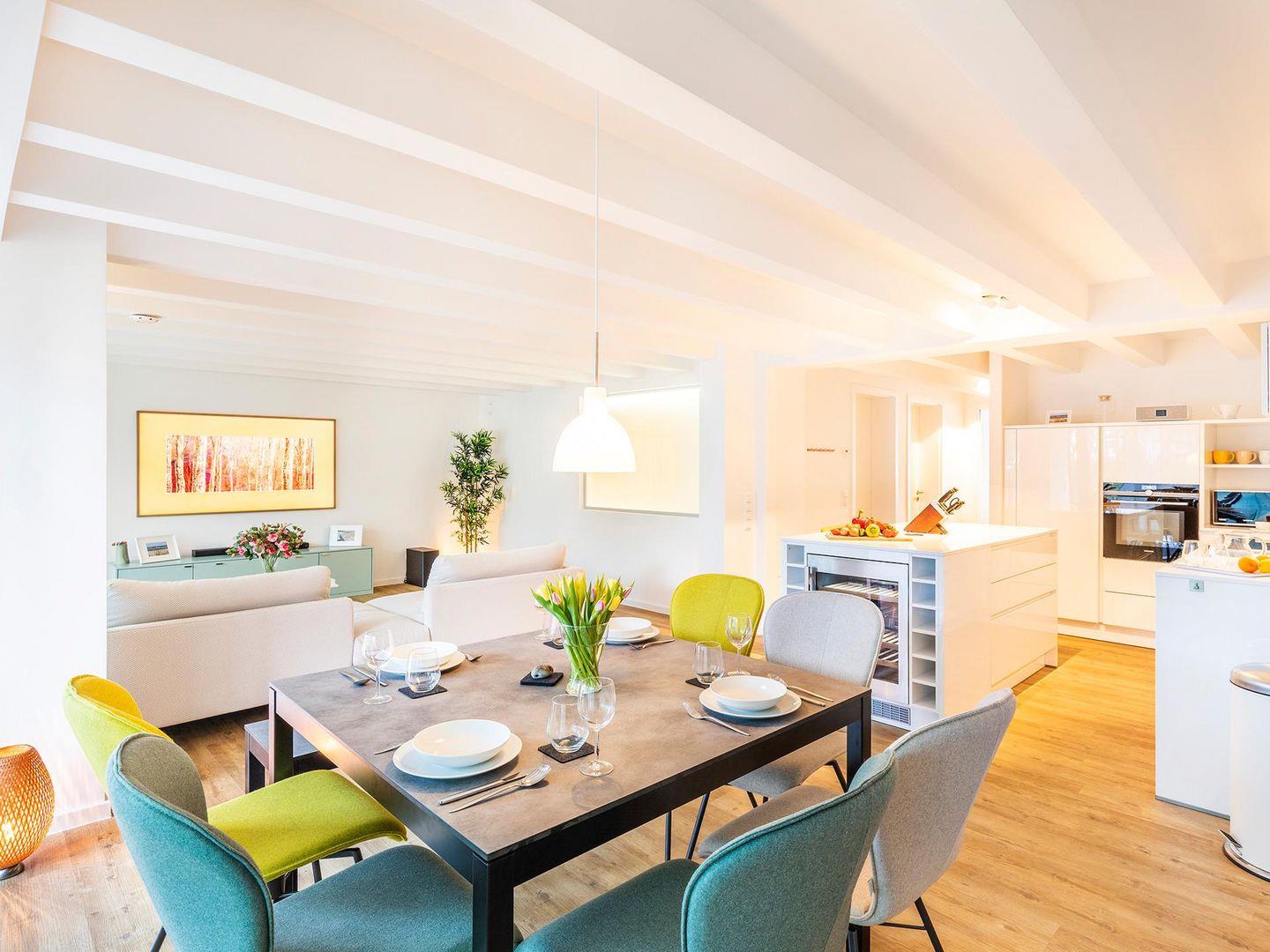 Im EG befindet sich der Garderobenbereich, ein Gäste-WC und meerseitig ein großes "Prinzessinnenschlafzimmer" mit eigener Terrasse und komfortabler Liegeinsel. Im 1. OG befindet sich meerseitig der großzügige offene Wohnbereich mit exzellenter Küchenausstattung, Weinkühlschrank und ein "Quooker Wasserhahn", der Ihnen auch gekühltes sowie kochendes Wasser auf Knopfdruck bietet. Eine große Sofalandschaft, eine bodentiefe Panoramaglasfront und ein 16 m² großer Balkon mit Loungemöbeln lässt Sie mit Blick aufs Meer herrlich entspannen.