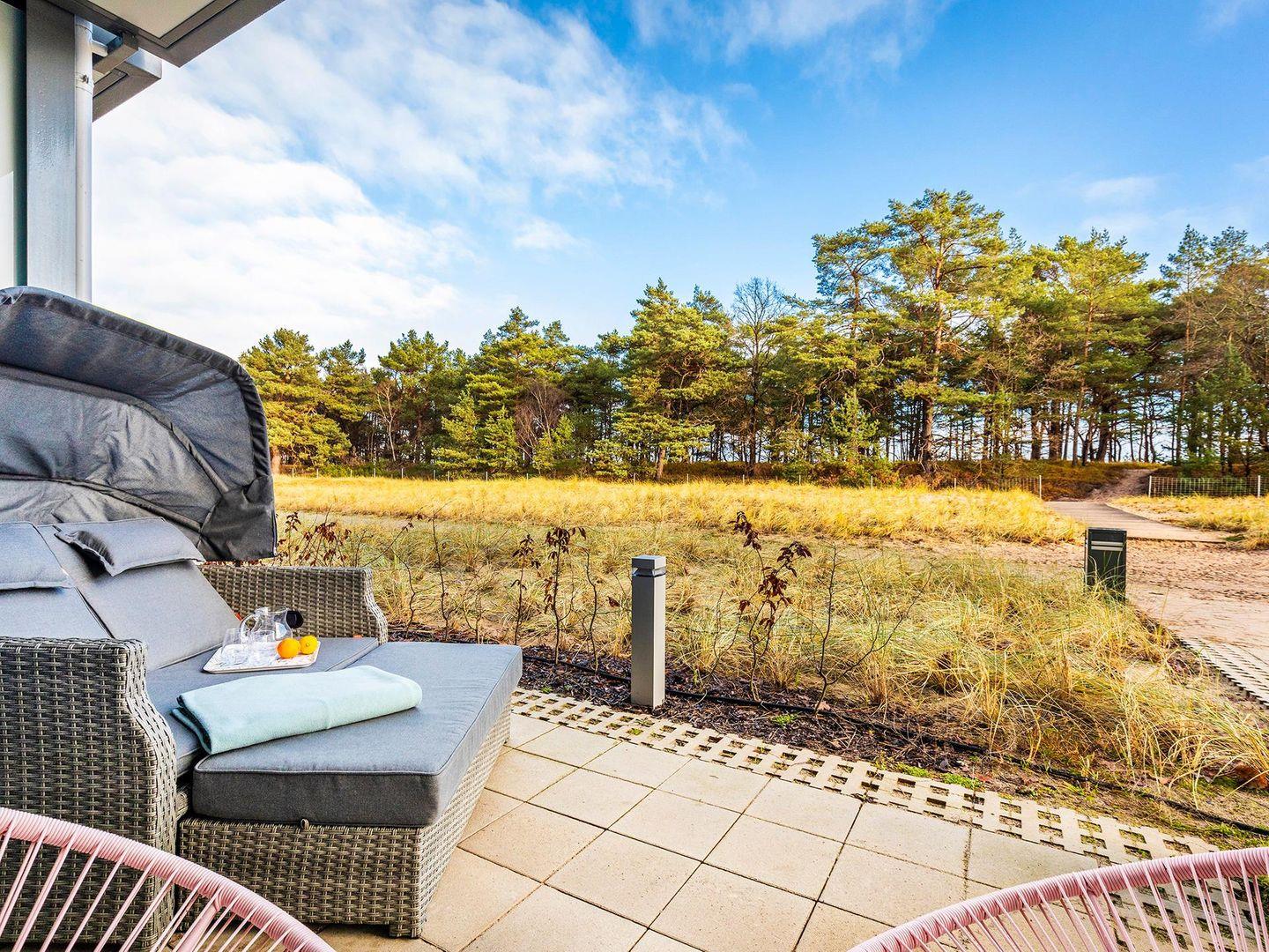 - Terrasse 1 (Ost-Ausrichtung): Sitzmöglichkeit mit Blick auf die Dünenlandschaft