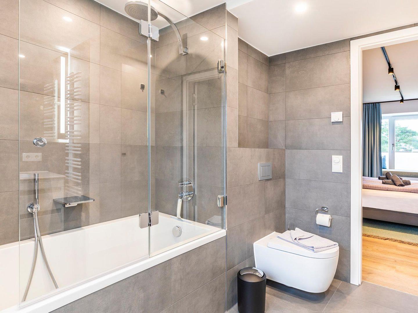 Es gibt zwei Badezimmer in der Ferienwohnung. Das erste Badezimmer ist mit einer Badewanne, einem WC und einem Haartrockner ausgestattet. Das zweite Badezimmer verfügt über eine Regendusche, ein WC und ebenfalls einen Haartrockner.