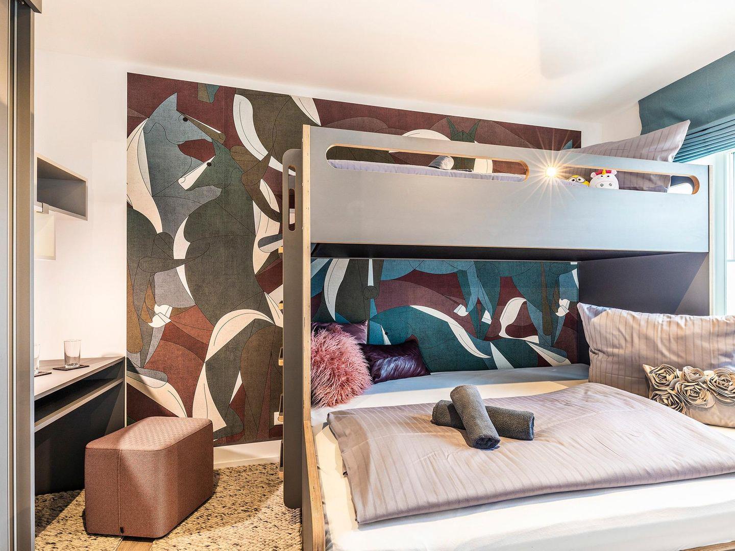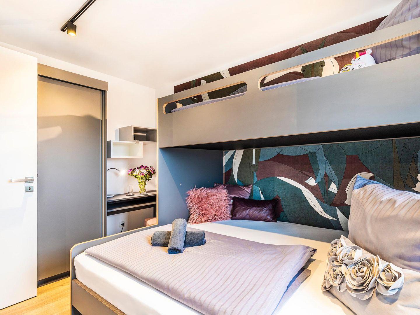 - Schlafzimmer 2: Etagenbett (160/90 x 200), Kleiderschrank, Schreibtisch