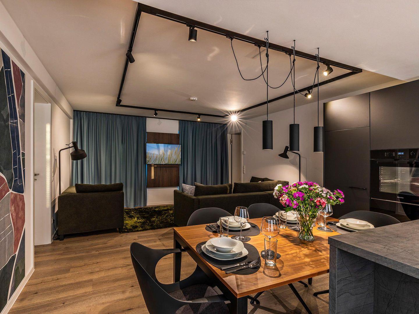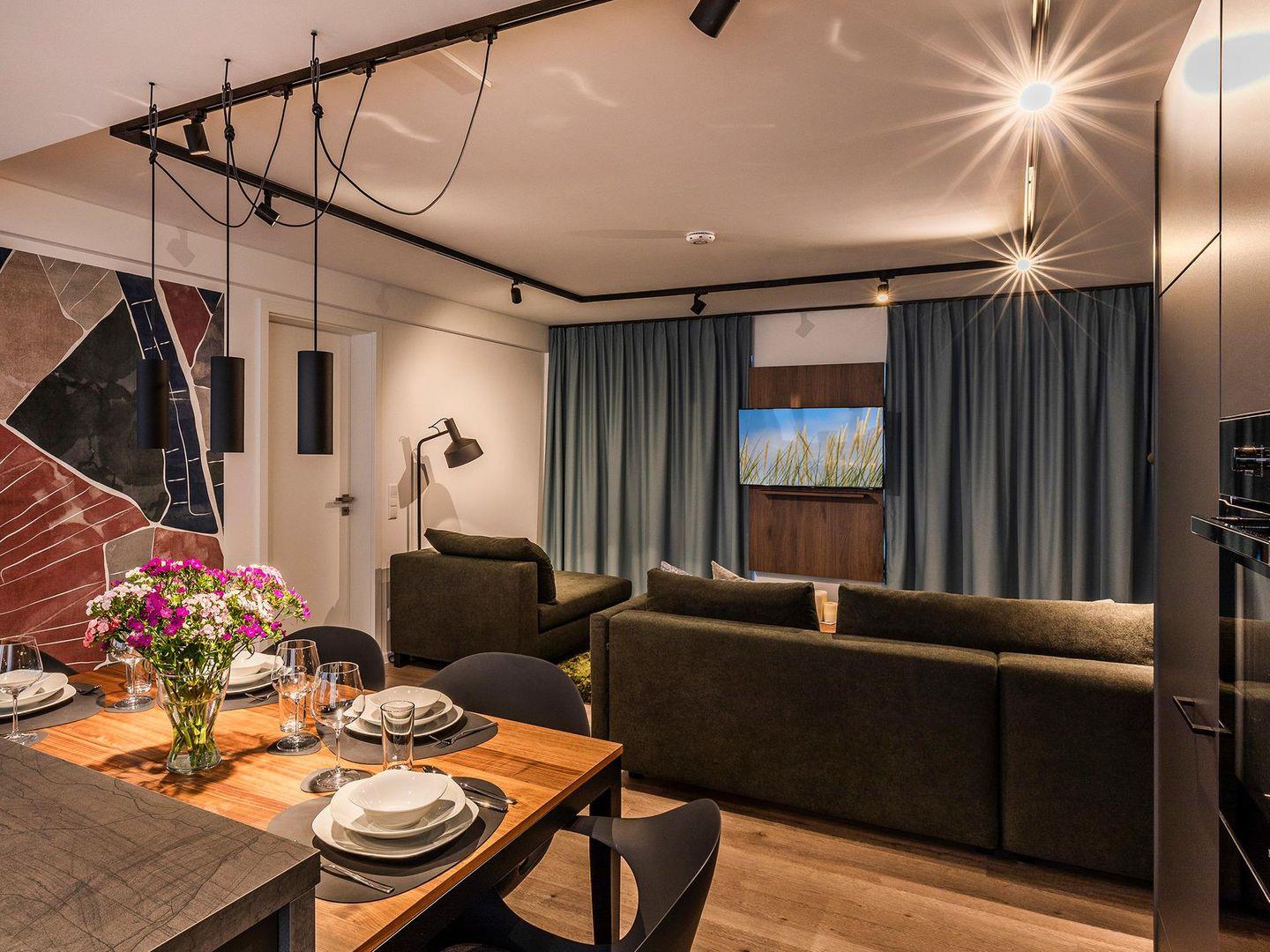 - Wohn-/Essbereich: Couchgruppe mit Tisch, Smart-TV, Essbereich, Zugang zum Balkon mit Tisch und Stühlen (Seeseite), Sonnenschirm