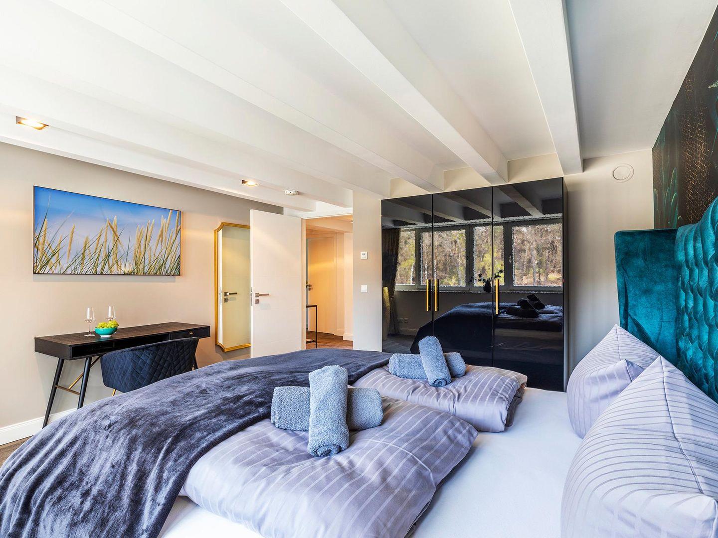 - Schlafzimmer 1 (Seeseite): Doppelbett (180x200), TV, Zugang zum Balkon