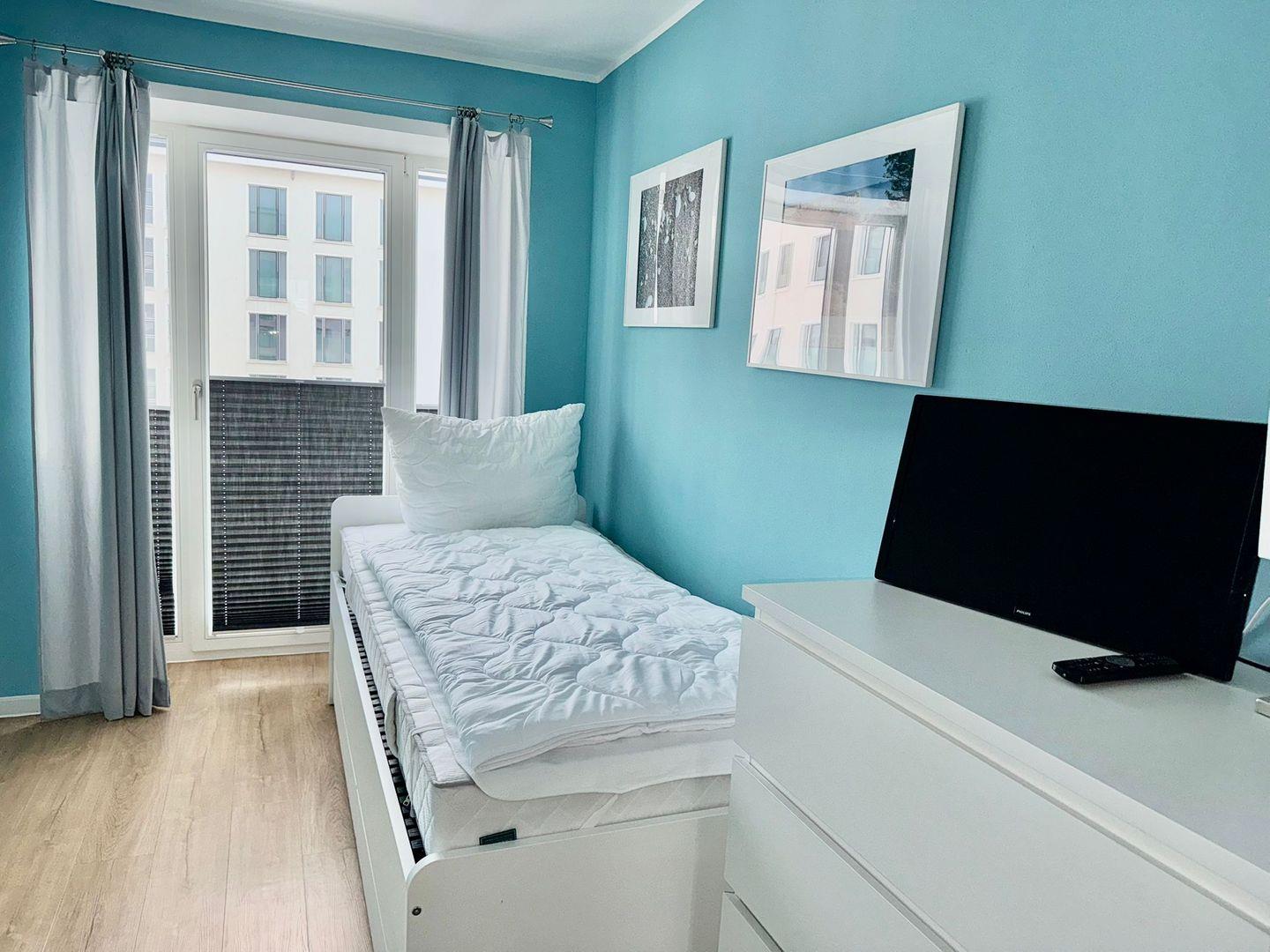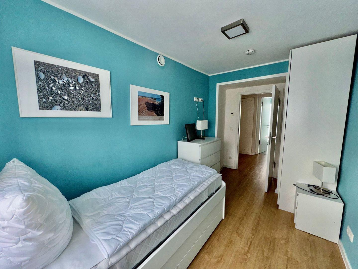 - Schlafzimmer 2: Einzelbett (80x200) mit rausziehbarem Unterbett (80x200), Smart-TV, Plissees und Gardinen