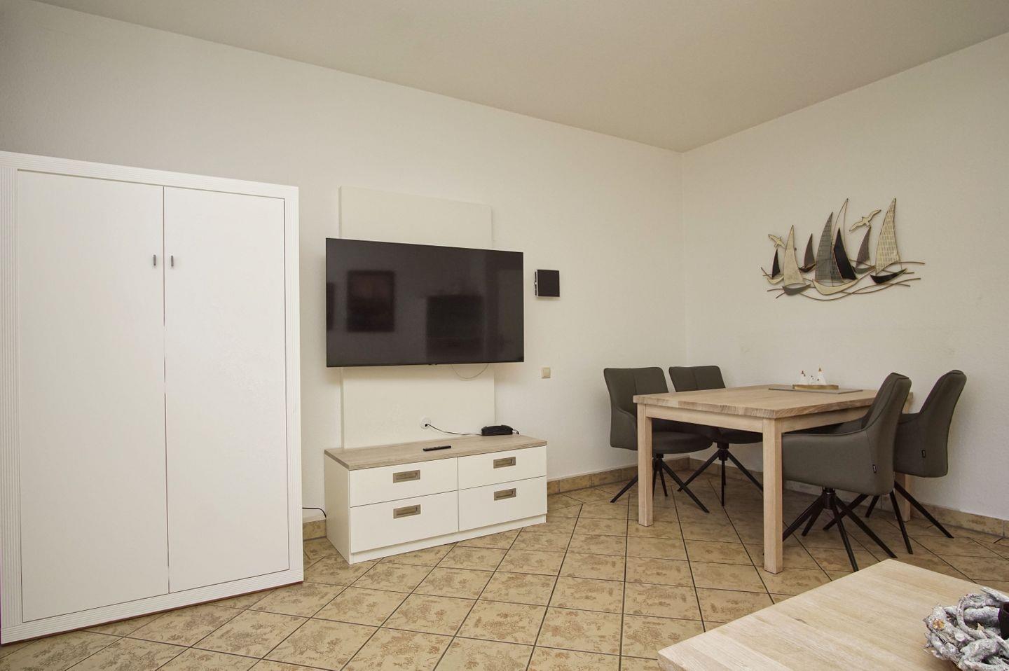 WOHNEN // Wohnraum mit Essbereich, Sitzgarnitur mit bequemer Schlafcouch, Schrankbett, Kabel-TV ++