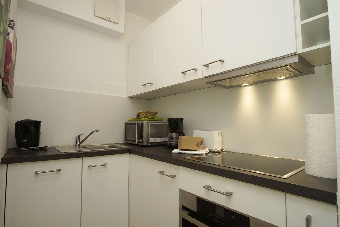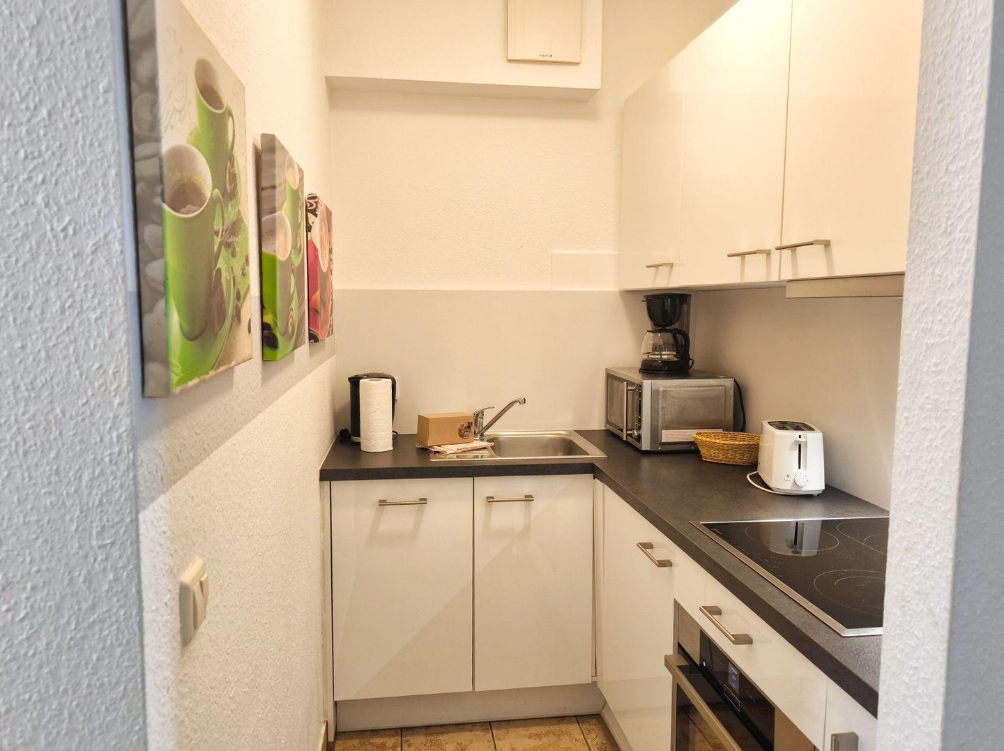 KÜCHE // Küchenzeile, 2-Platten Ceranherd, Backofen, Kühlschrank mit Gefrierfach, Spülmaschine, Toaster, Wasserkocher, Kaffeemaschine, Mikrowelle, reichlich Besteck, Geschirr und Küchenutensilien ++