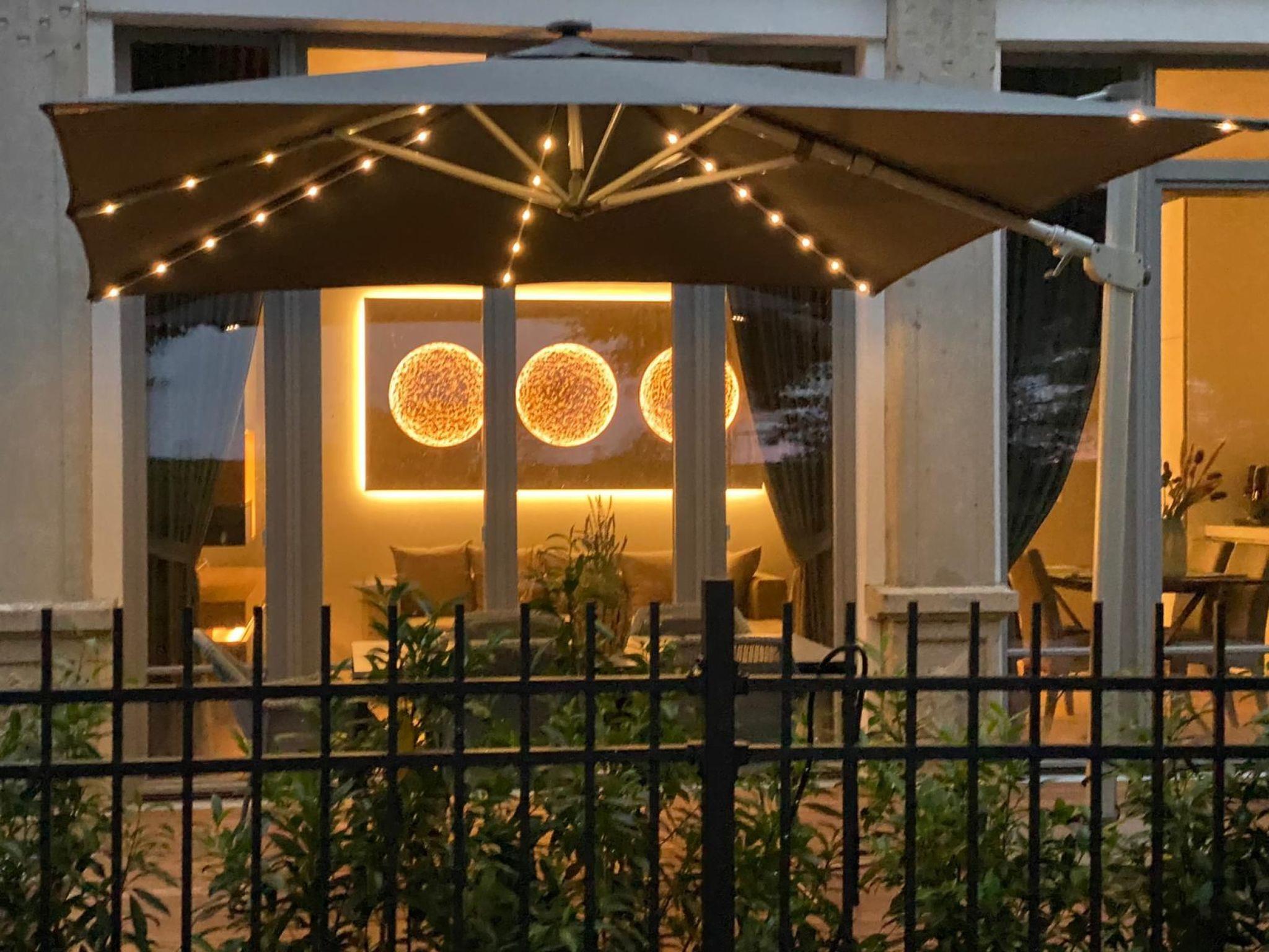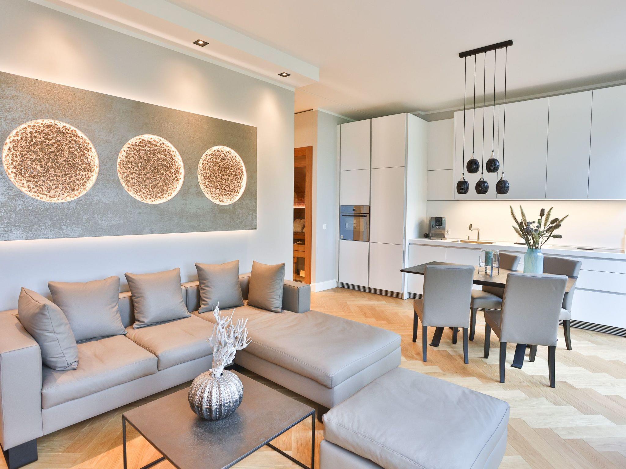 Living areaThe large open-plan living room with integrated kitchen area has direct access to the almost 10 square metre terrace where you can enjoy your morning coffee with a limited sea view. In the living room, a genuine leather couch with a view of the 55-inch flat screen TV awaits you. The entire living room is dimmable with different lamps to illuminate what provides the special flair and mood. The entire living room has curtains and drapes to darken the entire living area.