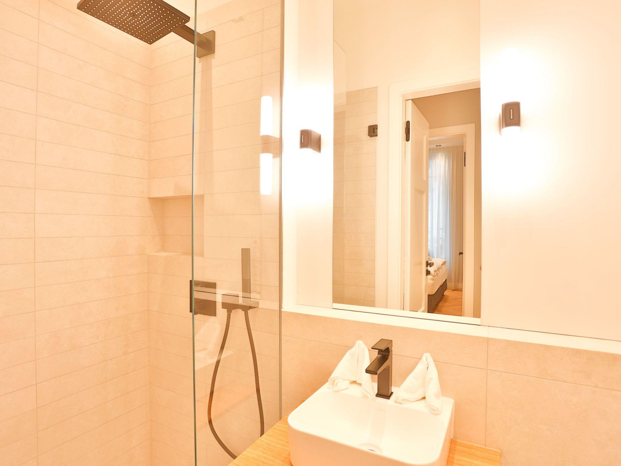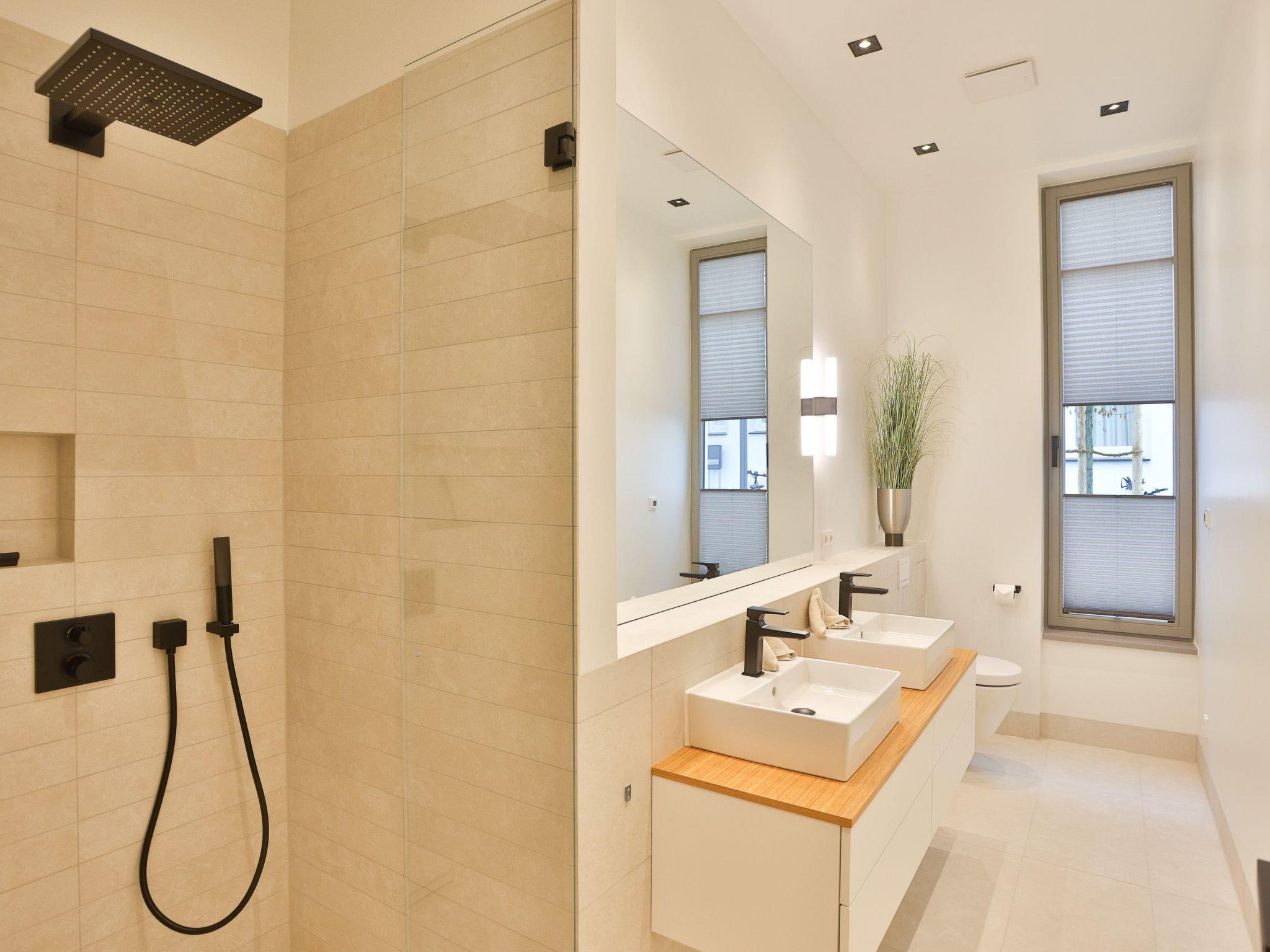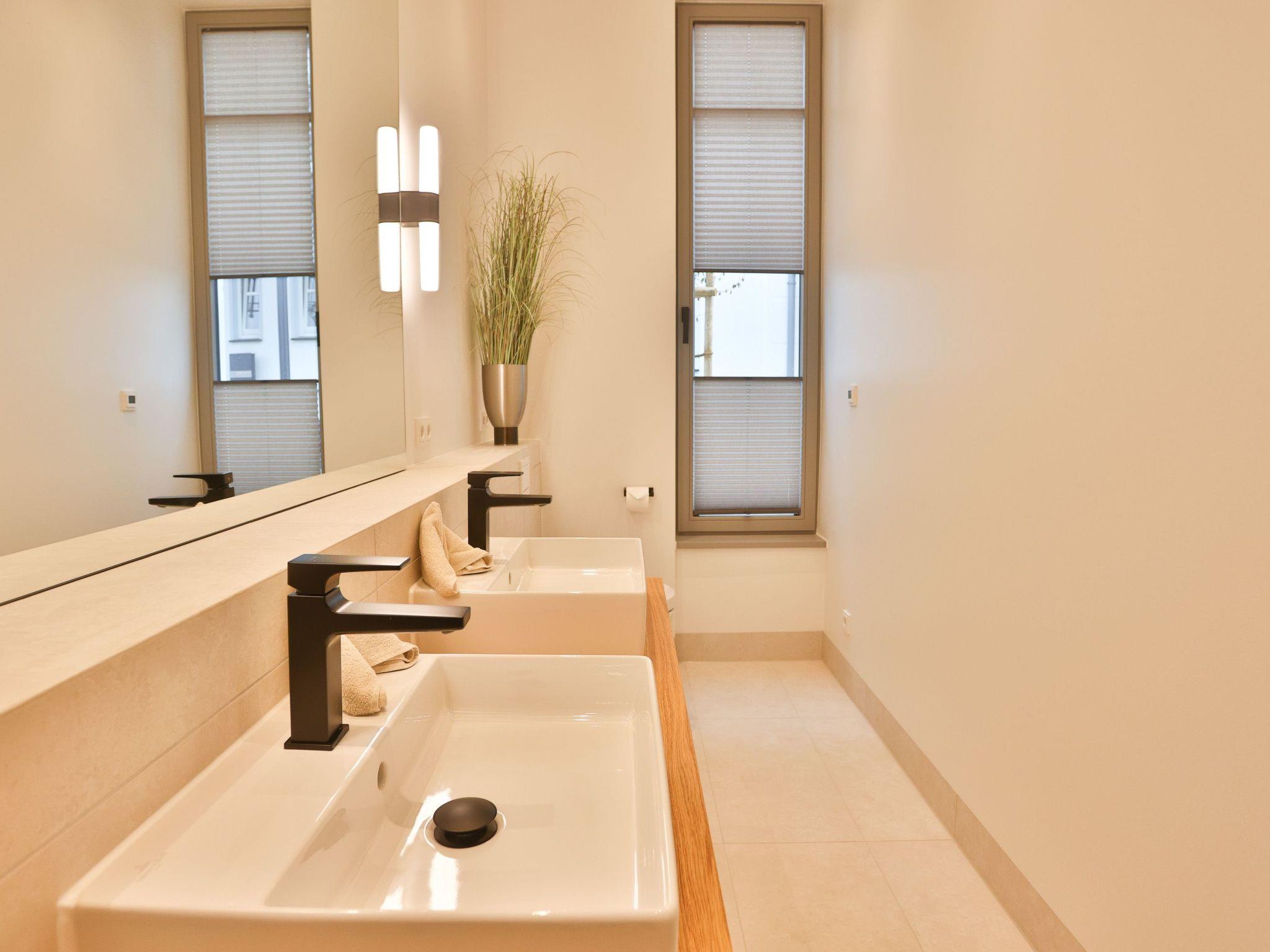 BathroomIn the bathroom you will find a large floor-level shower, a double washbasin and a toilet with window.