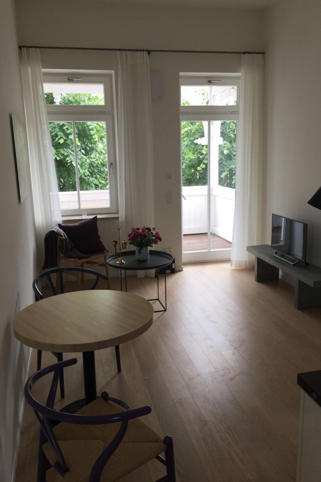 This flat is located on the ground floor of Villa Seeblick. The flat for up to two people and with a living space of 37 m² is furnished to a very high standard with selected designer furniture and has two rooms. In the large living room with Sony flat screen TV and open-plan kitchen you can relax after an eventful day. High-quality Siemens appliances make cooking a pleasure in the fully equipped kitchen. The dining area is right next to the kitchenette. You can sleep soundly in the spacious bedroom with a double bed (180 cm wide) and the modern bathroom with shower and WC ensures a lively start to the day. The floors of the holiday flat are made of oak parquet. From the living room and the balcony you have a beautiful side view of the Baltic Sea.