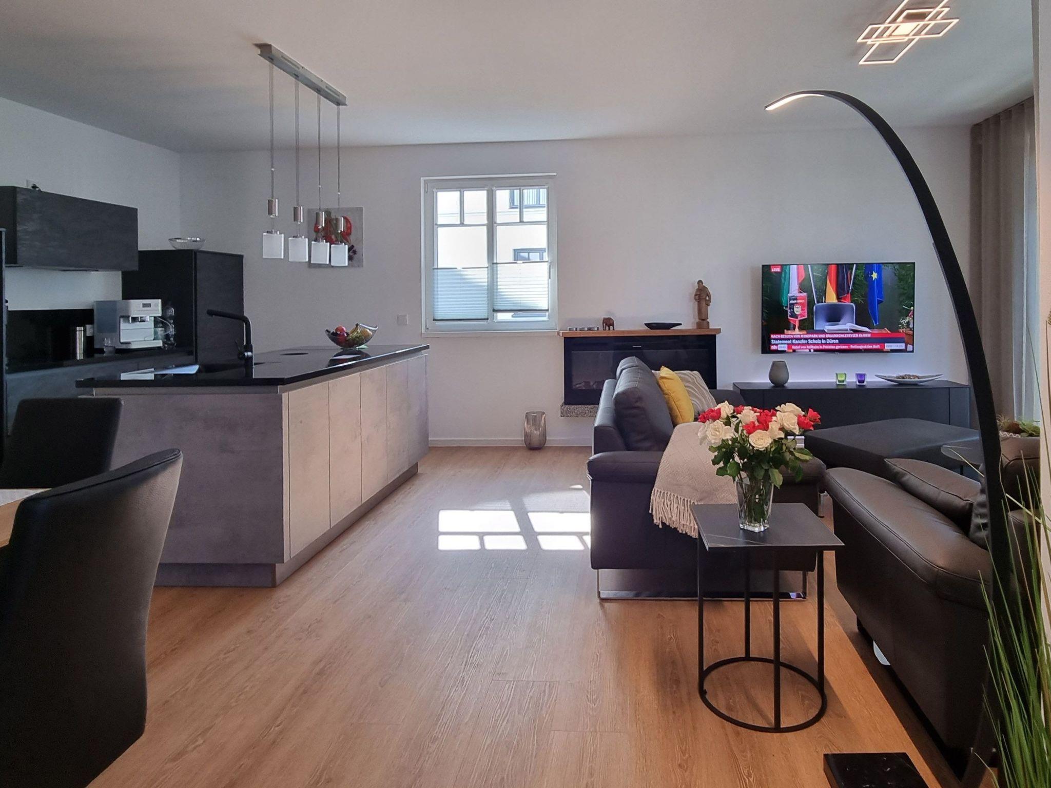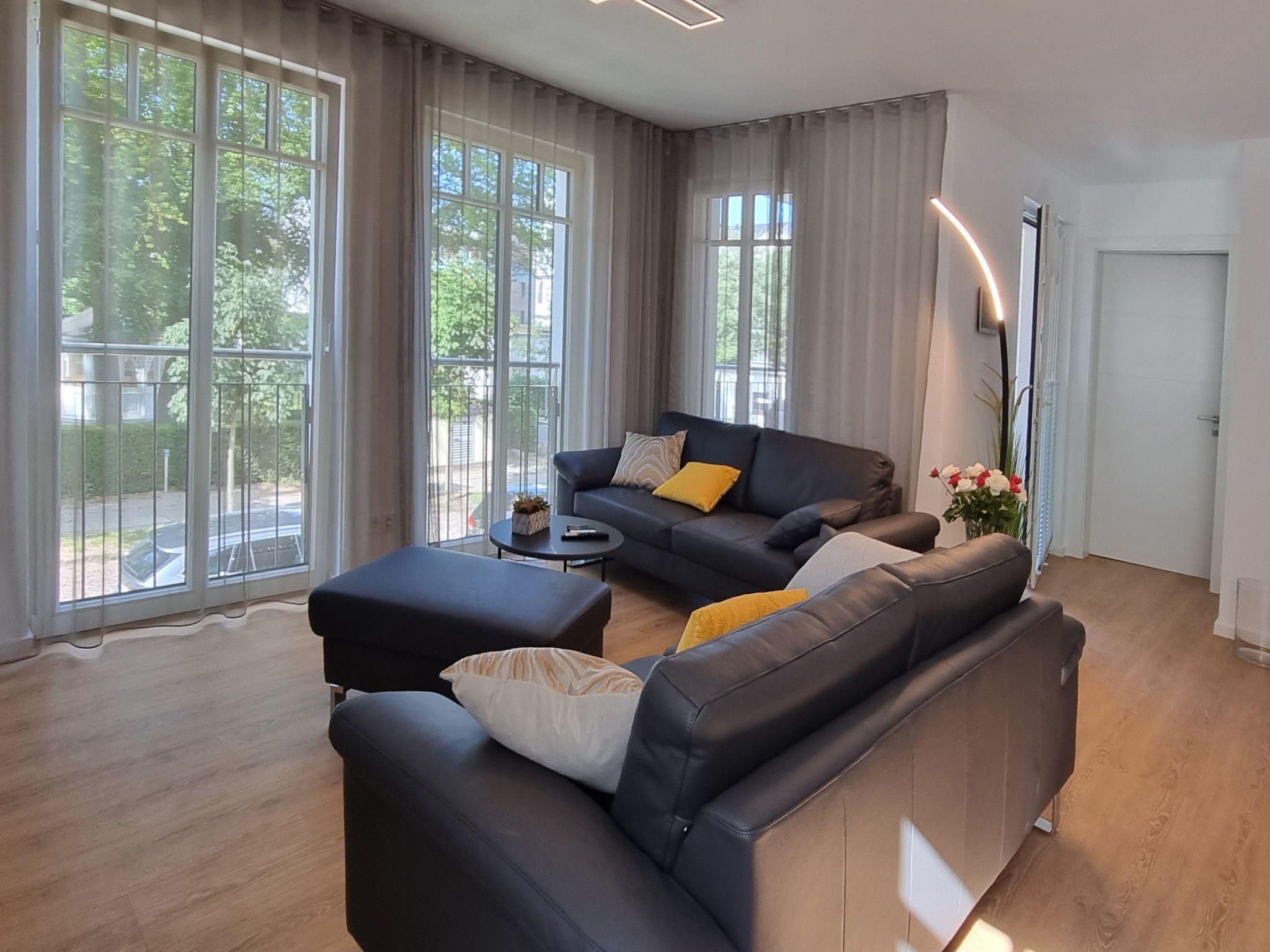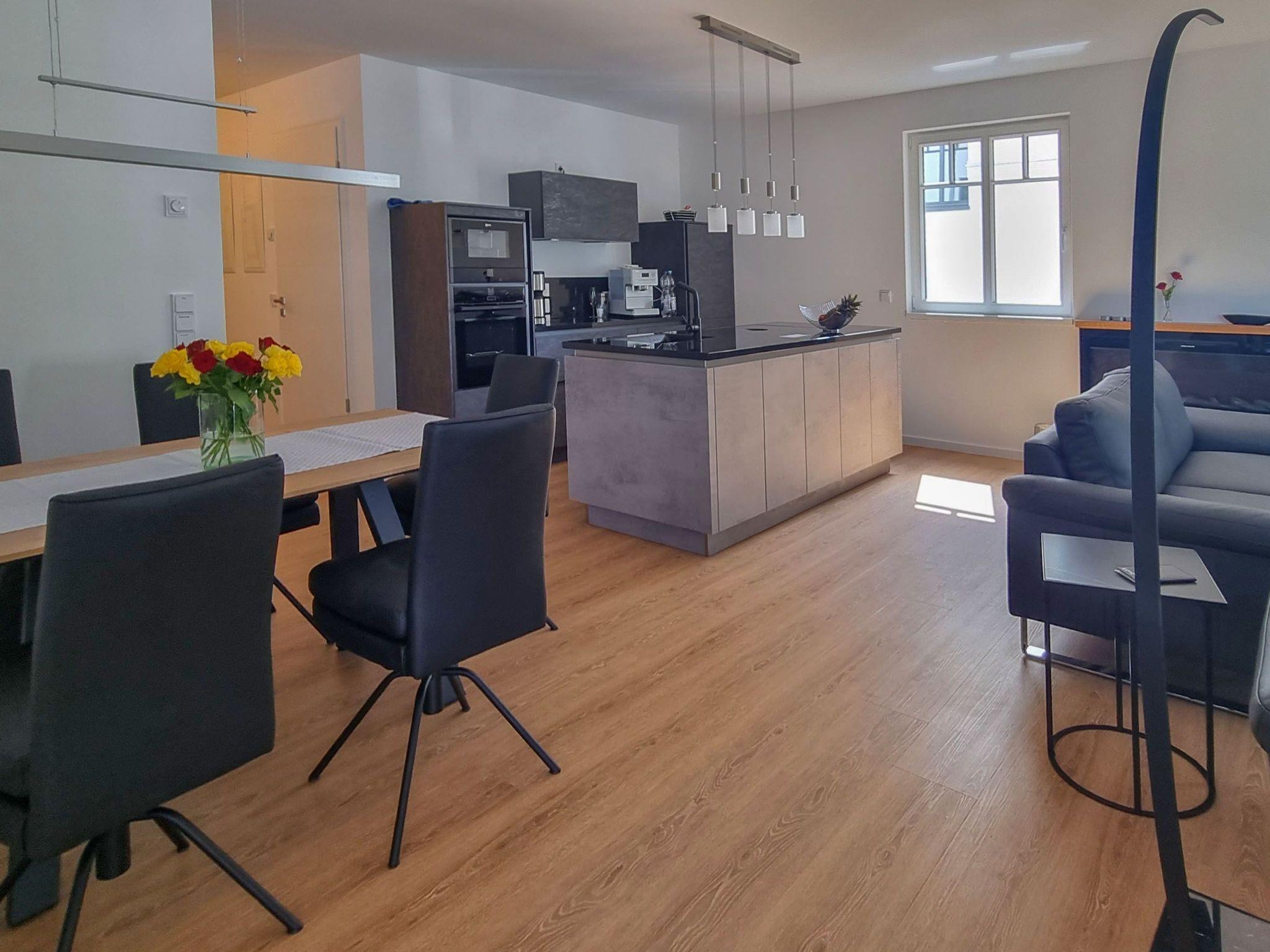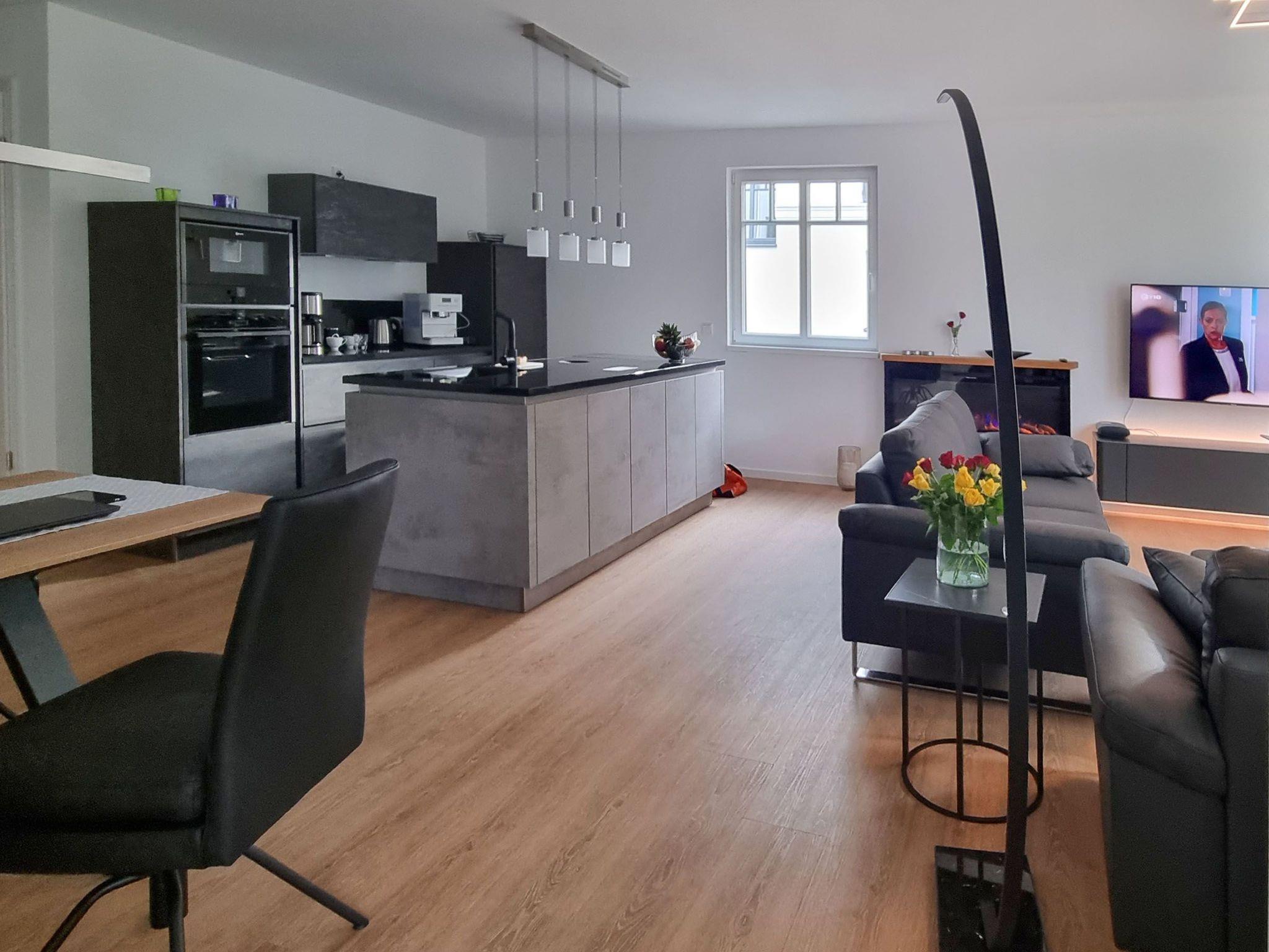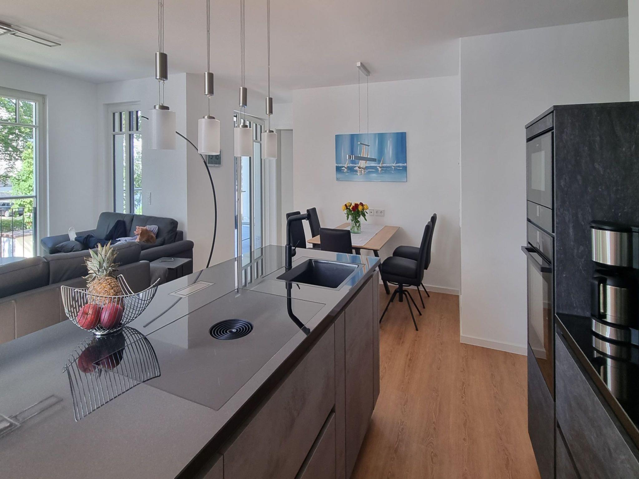 A luxurious living experience awaits you inside the holiday flat. The 34 m² living room is furnished with comfortable upholstered furniture and an inviting electric fireplace, which creates a cosy atmosphere. A modern 55-inch TV, LAN and WLAN throughout the flat provide the best entertainment. Two bedrooms with high-quality Schlaraffia box-spring beds and their own TVs offer optimum sleeping comfort. Underfloor heating throughout the flat rounds off the cosy feel. The extensively equipped kitchen with cooking island, granite worktops and high-quality Miele appliances leaves nothing to be desired and promises culinary highlights.