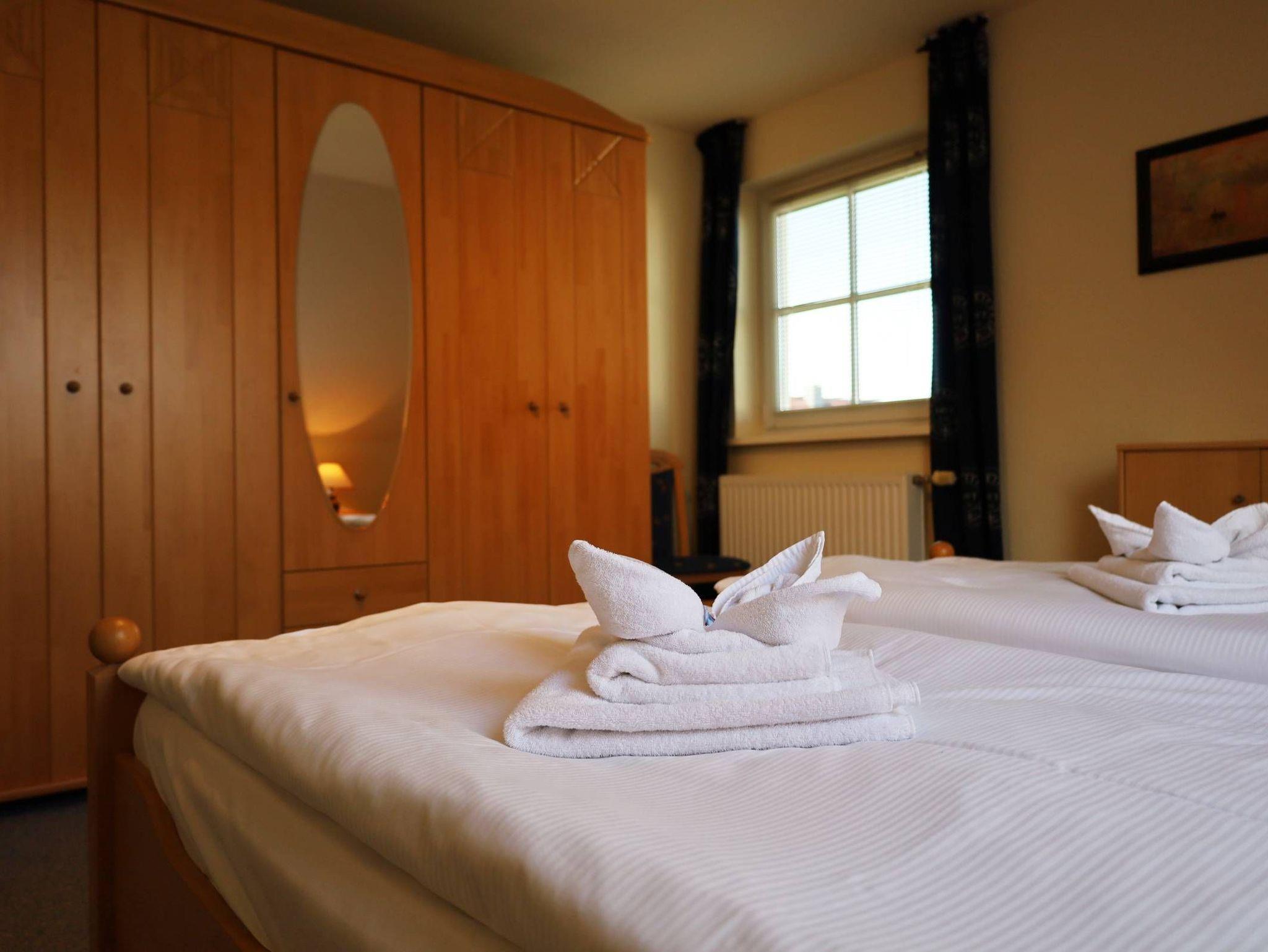 Zwei separate Schlafzimmer, wobei das 1. Schlafzimmer mit komfortablen Doppelbett sowie einem großräumigen Kleiderschrank und das 2. Schlafzimmer mit zwei zusammengestellten bequemen Schlafliegen (können auch getrennt gestellt werden) sowie einem Relaxsessel und einem zusätzlichen Flachbildfernseher ausgestattet sind. Das Badezimmer mit Fenster verfügt über eine Dusche. Zur Wohnung gehört ein eigener Pkw-Stellplatz hinterm Haus. Das Apartment ist eine Nichtraucherwohnung.