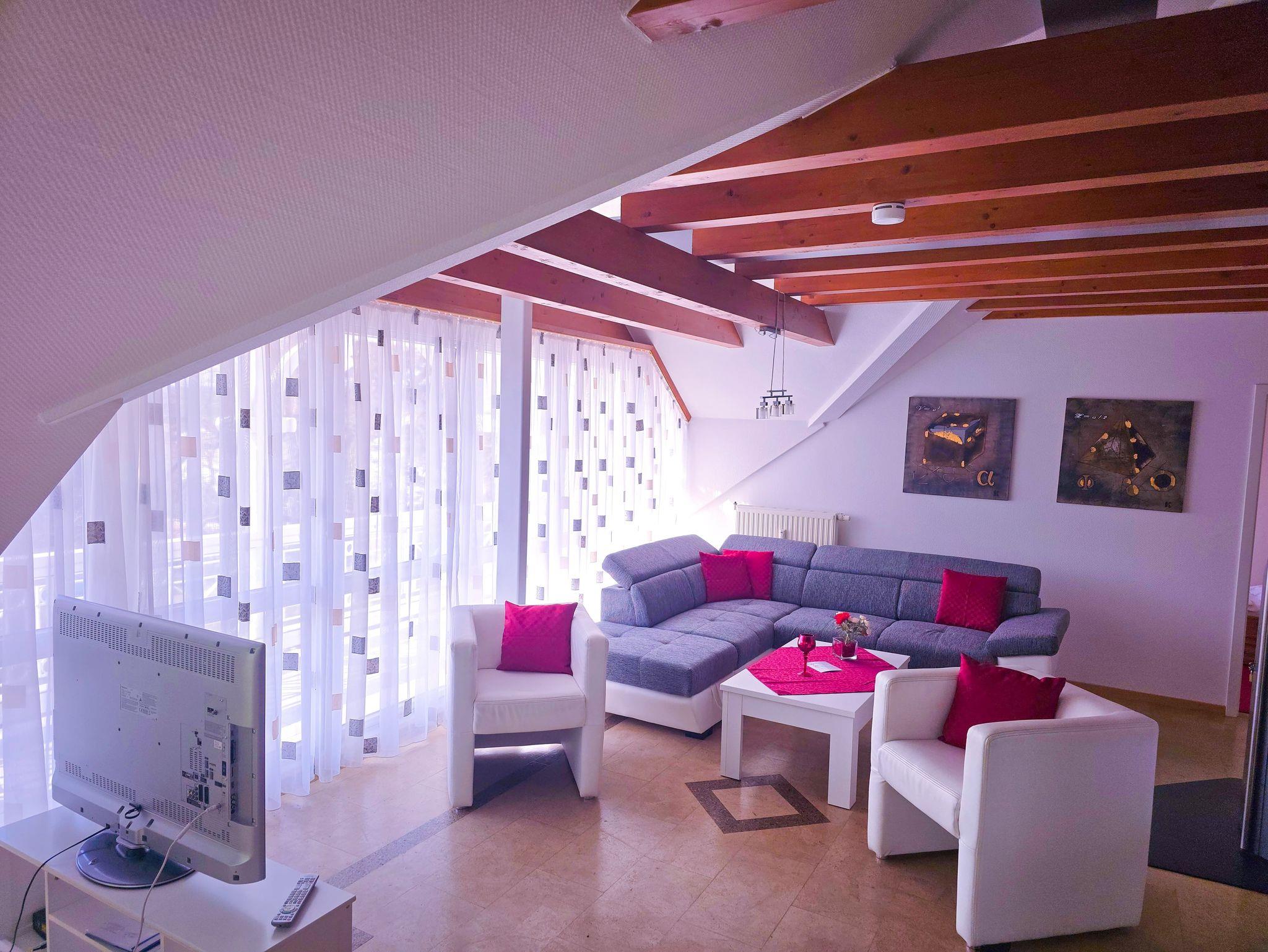 Die 3 Raum Appartements der Kategorie K sind ca. 80 qm groß und befinden sich im Dachgeschoß (= 3. Obergeschoß). Die Wohnung verfügt über einen sehr großen Balkon. Es stehen Ihnen ein Wohnraum mit Küche, ein Badezimmer mit Dusche, Eckbadewanne und WC und eine separate Toilette sowie zwei Schlafzimmer zur Verfügung. In einem Schlafraum steht ein Doppelbett mit zwei Matrazen, in dem anderen sind zwei Einzelbetten. Für ein Kleinkind bis 2 Jahre stellen wir Ihnen gerne ein Reisebettchen in die Wohnung (einmalig 15 ).