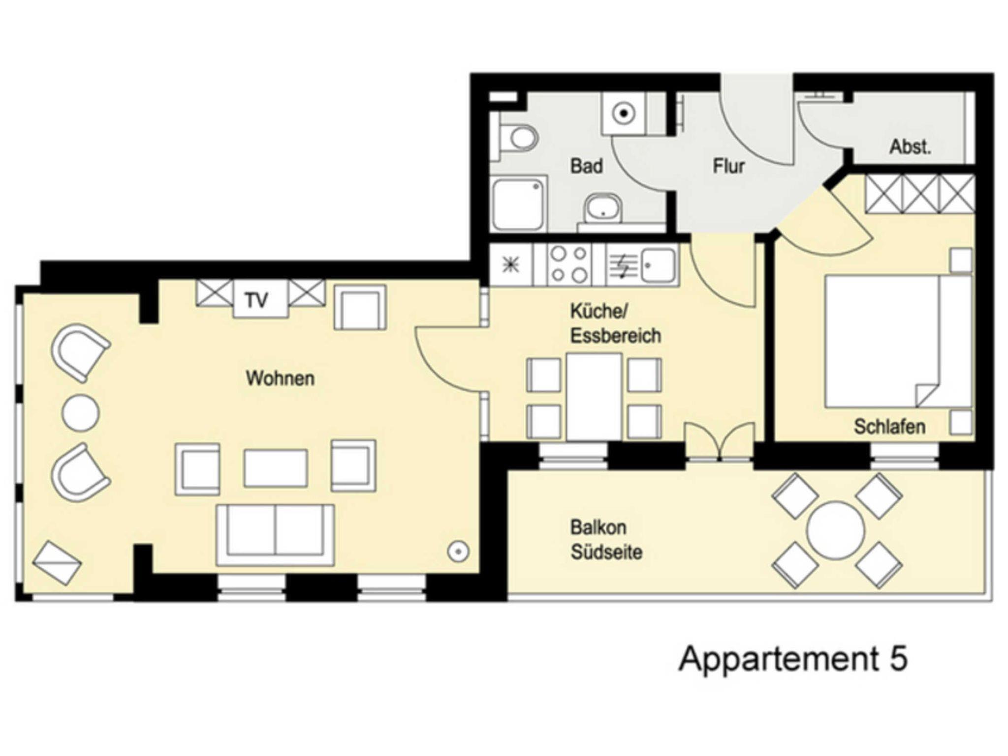 Appartement 5, 1.OG, (ca. 61 qm, max 4 Personen) 1 separates Schlafzimmer, 1 Wohn-Schlafzimmer, Lesebereich im offenen Wintergarten, Küche mit Essbereich, Bad (Dusche), Abstellraum, großer Balkon Südseite, Telefon, Flat-TV, Waschmaschine, Fön, W-LAN