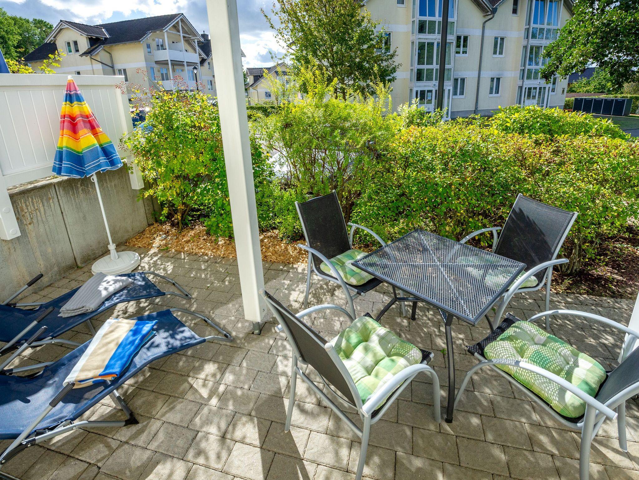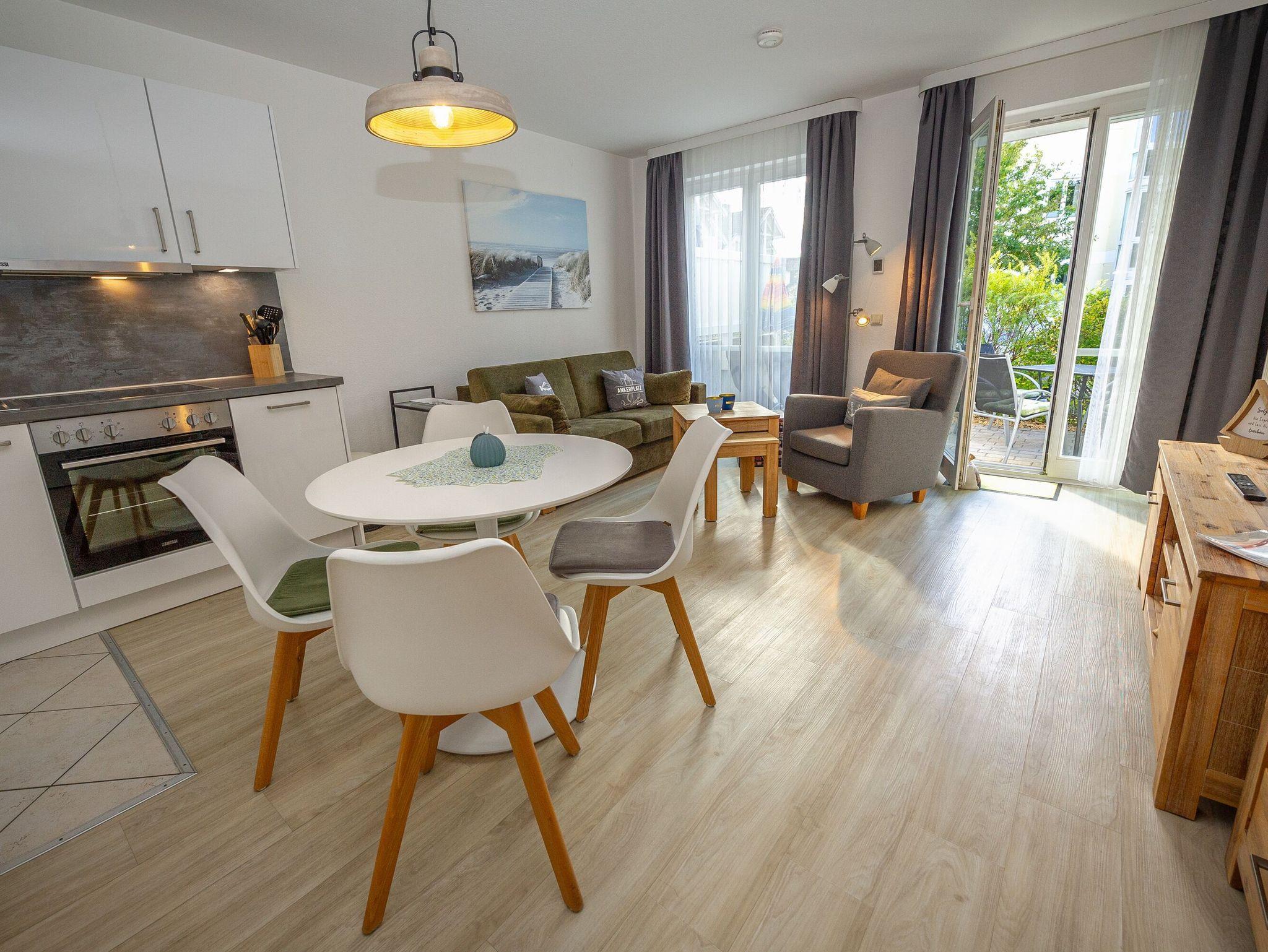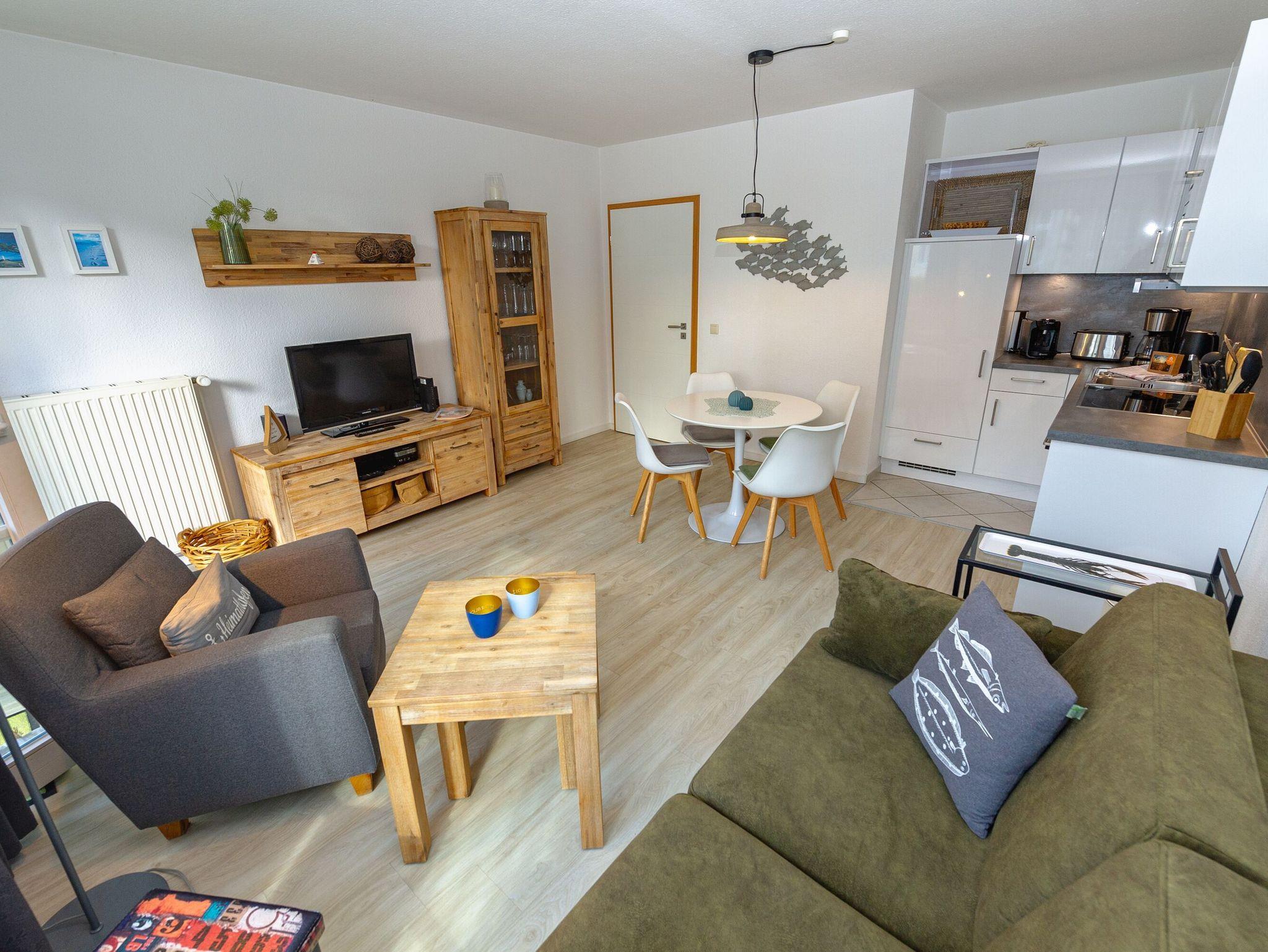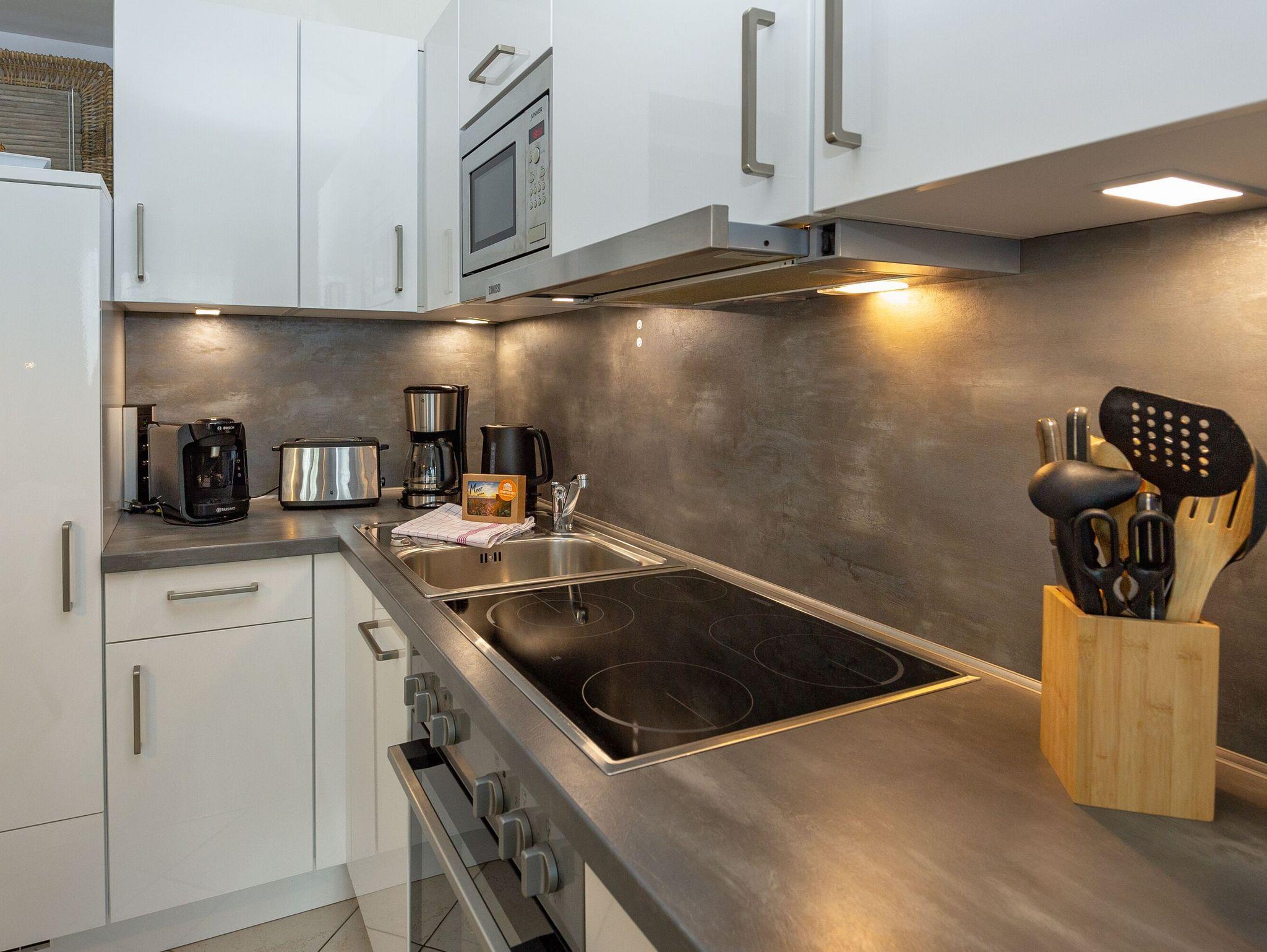 Der helle, freundliche Wohnraum mit vorgelagerter Terrasse zur sonnigen Südseite ist mit einem Esstisch, einer bequemen Schlafcouch (Aufbettungsmöglichkeit für zwei Personen), einem Sessel, einem Flachbild-TV mit Blu Ray-Player, Radio/CD-Player und einer modernen Küchenzeile eingerichtet. Diese ist allerbestens ausgestattet, damit Sie sich bequem selbst bekochen können, wenn Sie nicht gerade unterwegs in einem der überaus empfehlenswerten Lokale auf der Insel einkehren. So finden Sie hier neben einem 4-Zonen-Ceranherd mit Backofen und Abzugshaube, einer Mikrowelle und einem Kühlschrank mit Gefrierfach auch einen Wasserkocher, einen Toaster, eine Filterkaffeemaschine, eine Tassimo-Kaffeemaschine und natürlich das nötige Koch- und Essgeschirr vor.