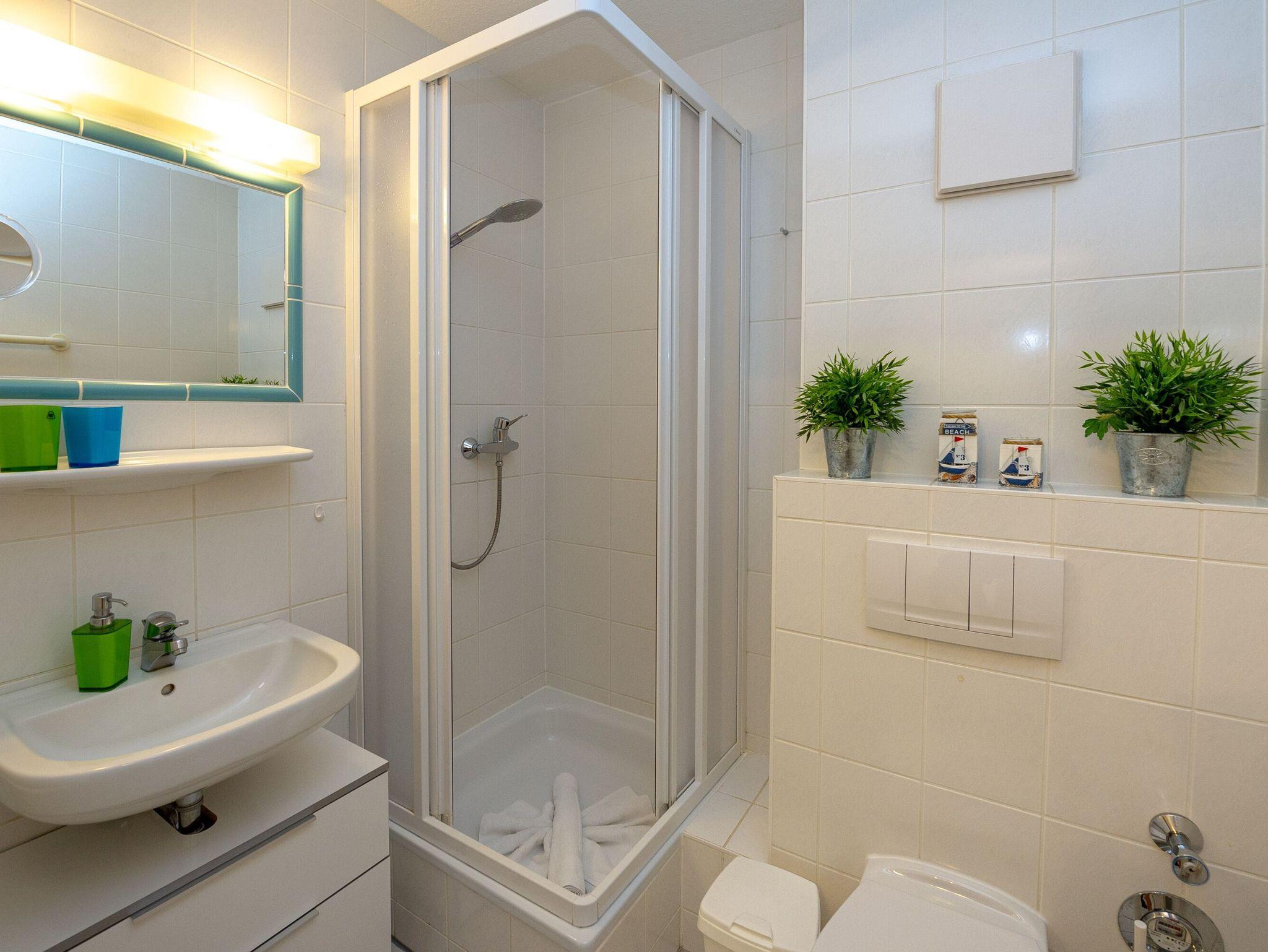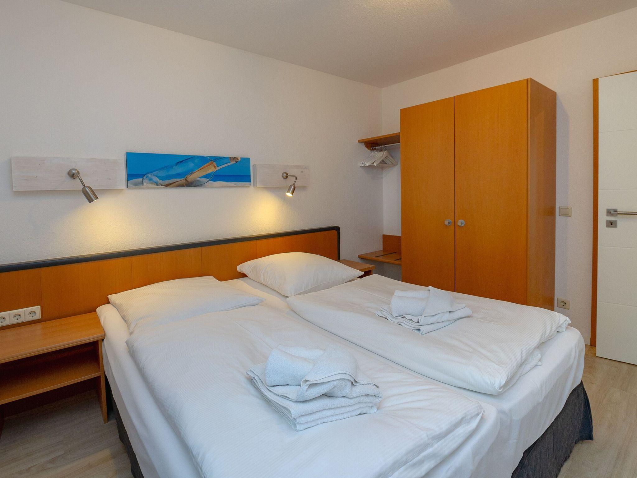 Das separate Schlafzimmer ist mit einem Doppelbett mit Visco-Komfortprofil-Kaltschaummatratzen und einem Kleiderschrank für Ihre Urlaubsgarderobe ausgestattet. Das innenliegende Badezimmer verfügt über Dusche/WC, Waschbecken, Spiegel und einen Haartrockner.