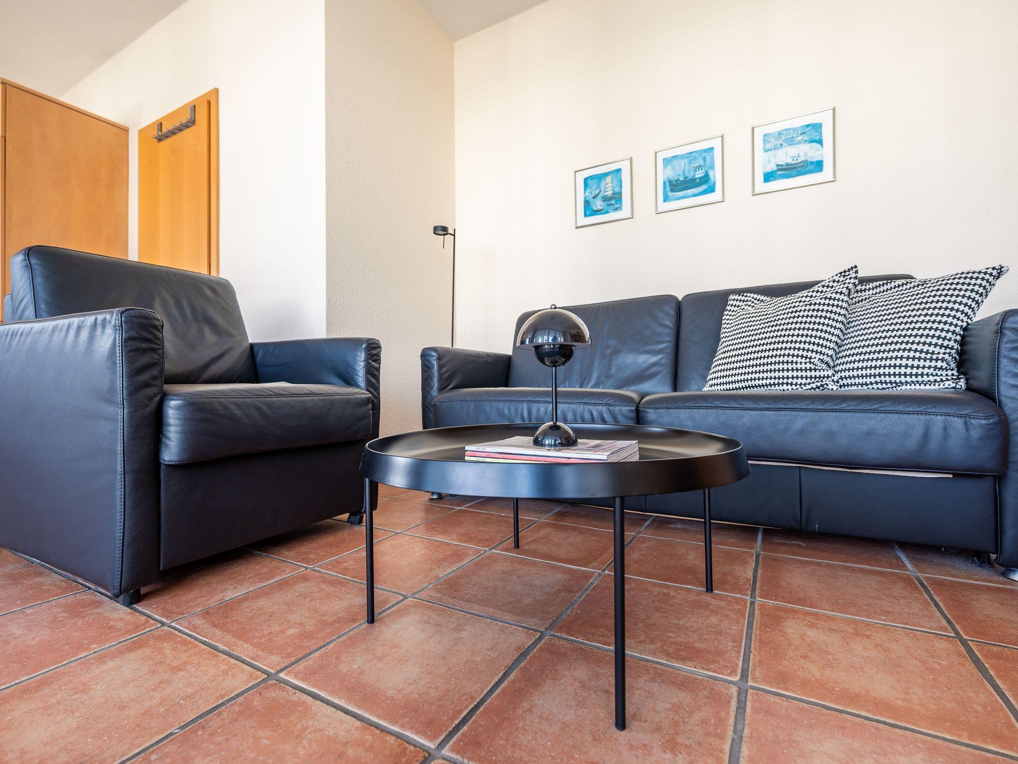 • Wohnzimmer: Bettsofa, Sessel, Tisch, Fernseher (Kabel), Internetanschluss (lan und wlan)