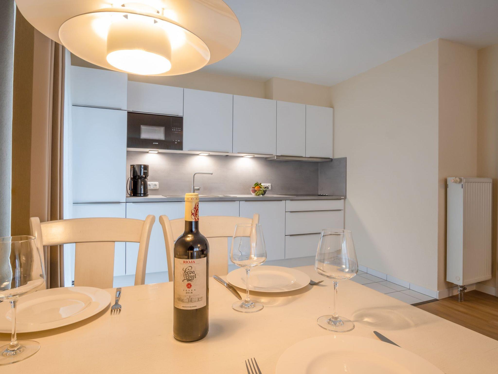 Die neue Küchenzeile und der Essbereich lädt mit einem Cerankochfeld, einem Kühlschrank sowie Geschirrspüler zum gemütlichen Kochen ein. Ebenfalls vorhanden sind Kaffeemaschine, Toaster, Wasserkocher, Besteck, Geschirr und Gläser.
