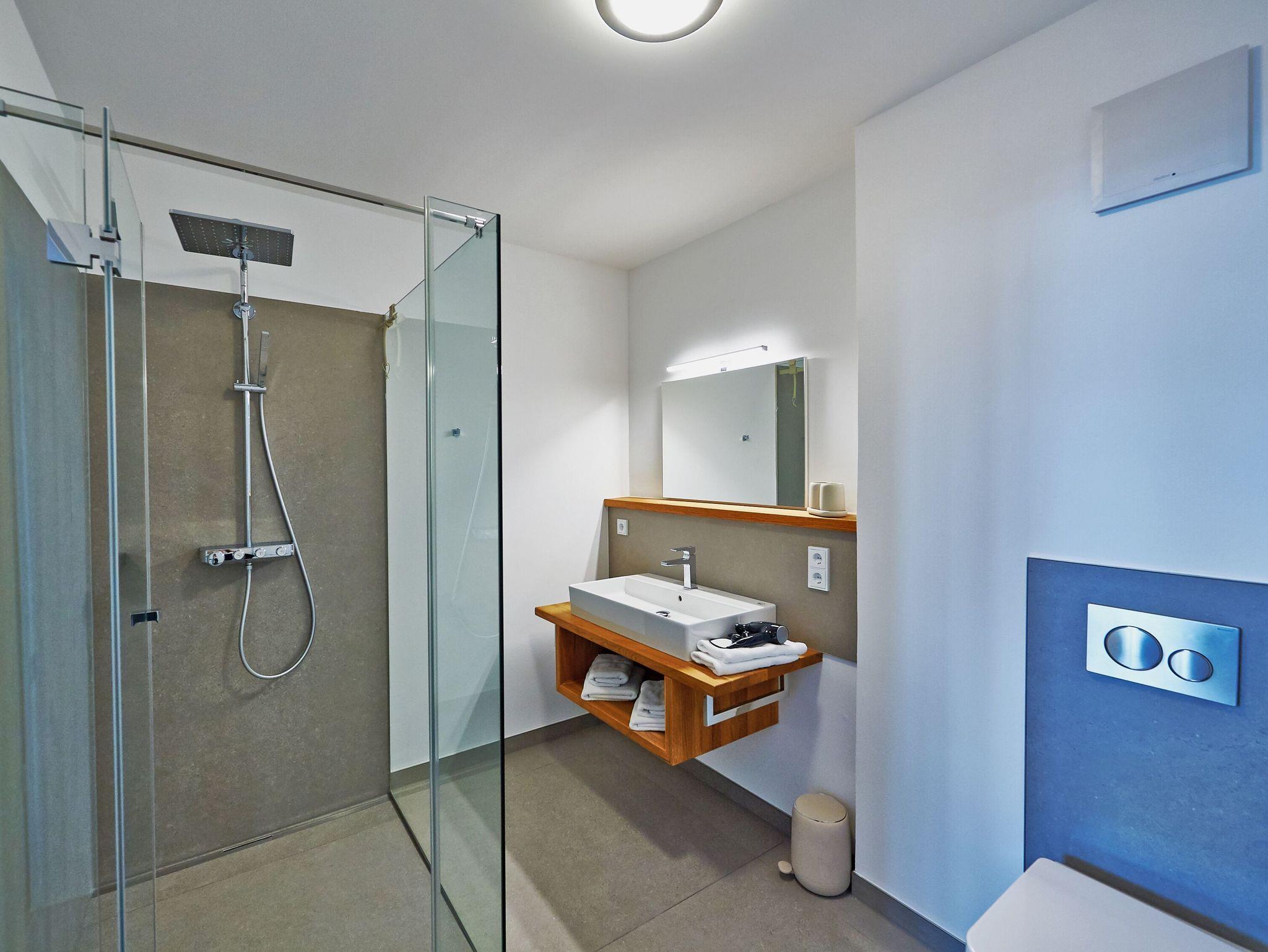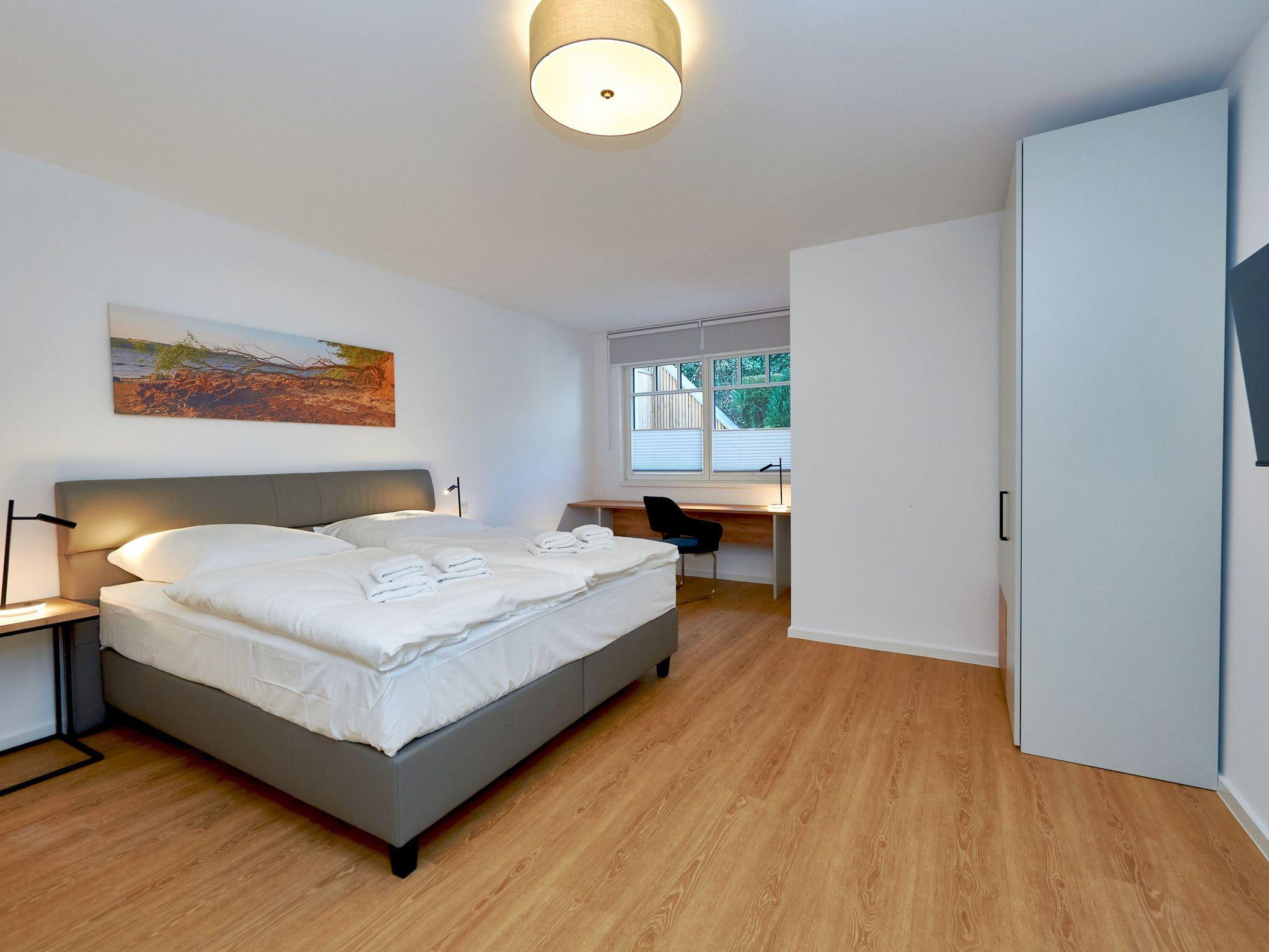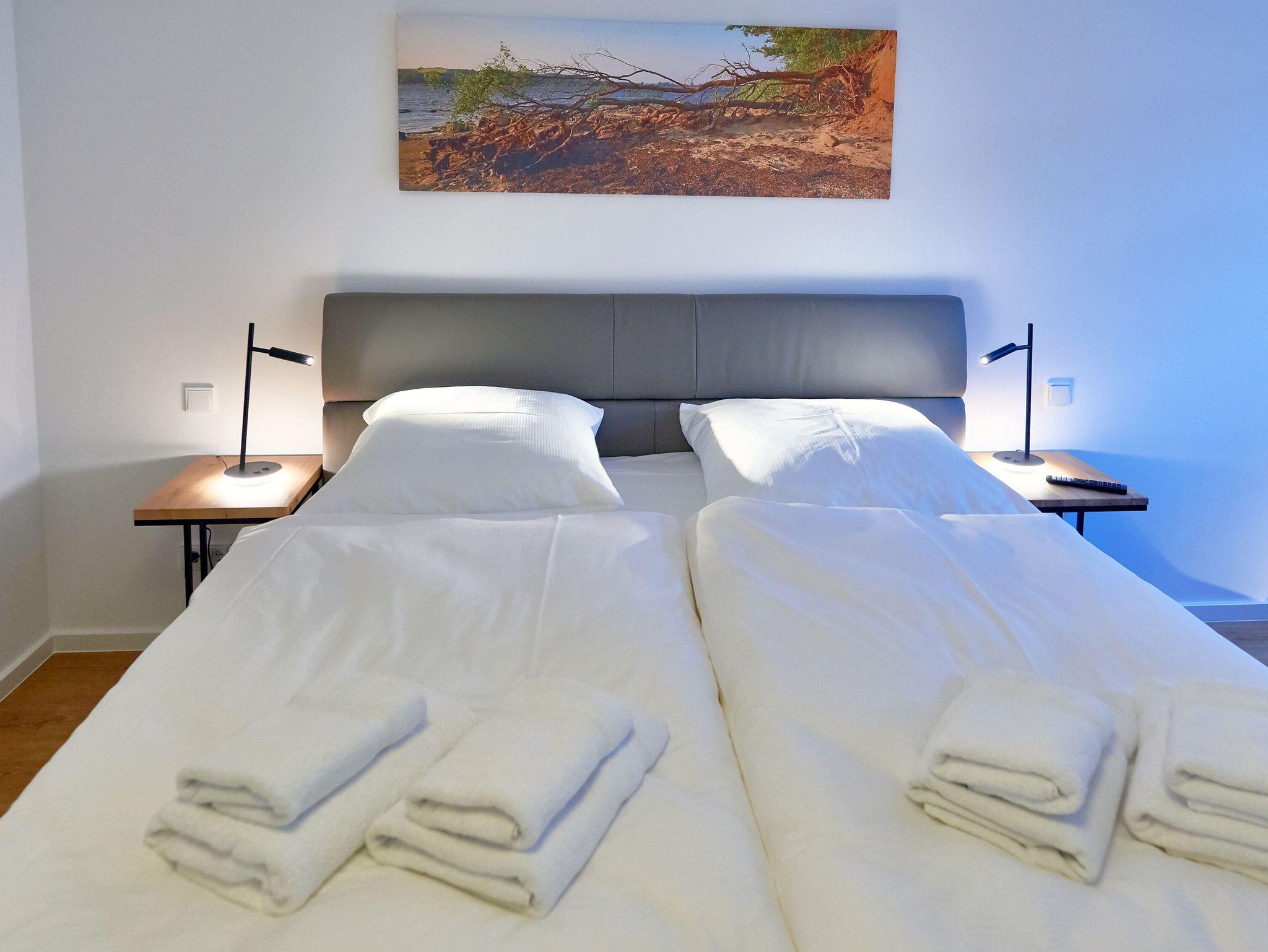 Die beiden Schlafzimmer sind mit überaus bequemen Boxspringbetten (1,80 x 2,00m), großzügigen Kleiderschränken für Ihre Urlaubsgaraderobe und zusätzlichen Fernsehgeräten ausgestattet. Jeweils angeschlossen ist ein eigenes Badezimmer mit bodentiefen Duschen, WC, beleuchtetem Waschtisch, Fön und beheizbarem Handtuchtrockner.