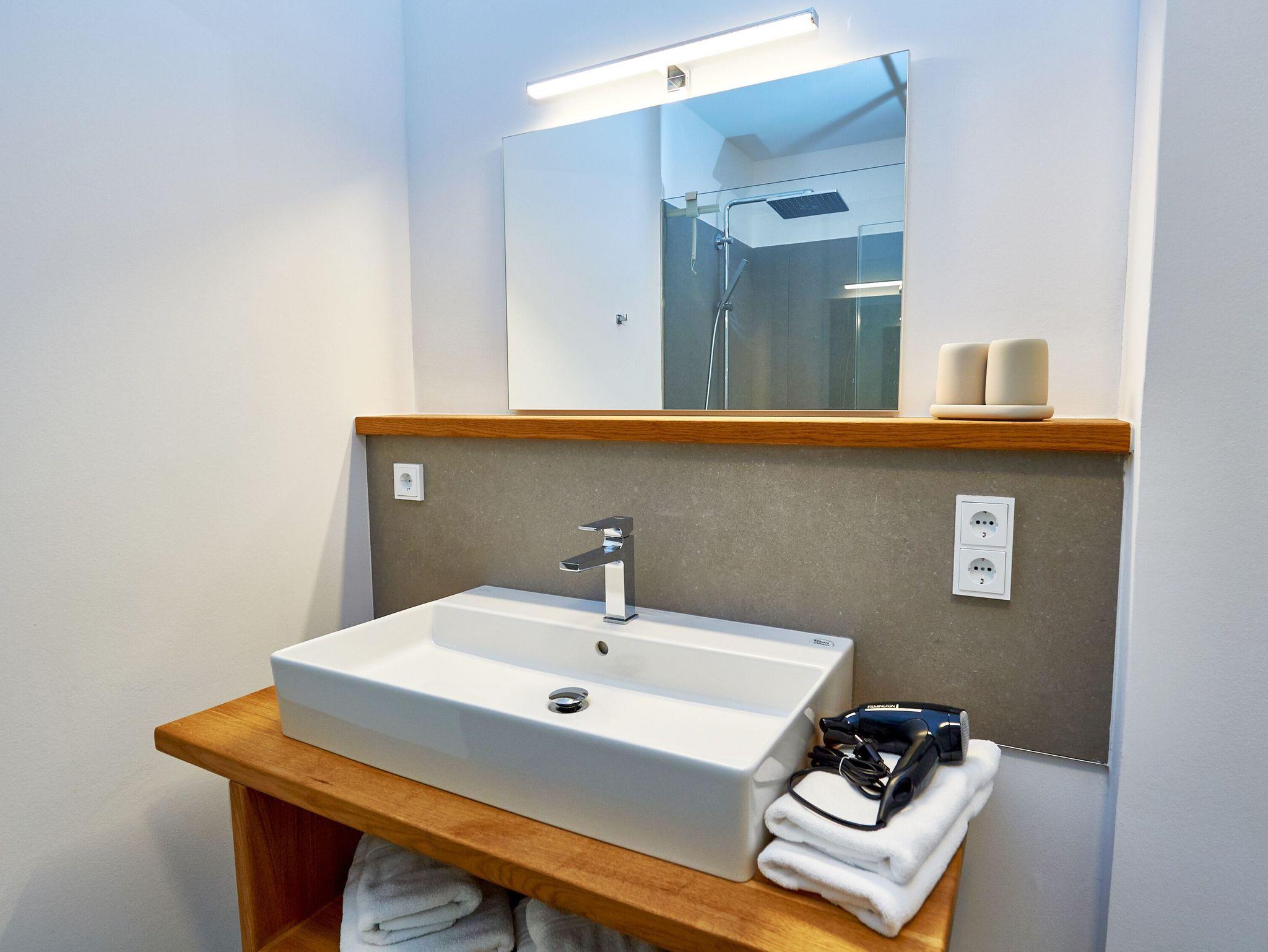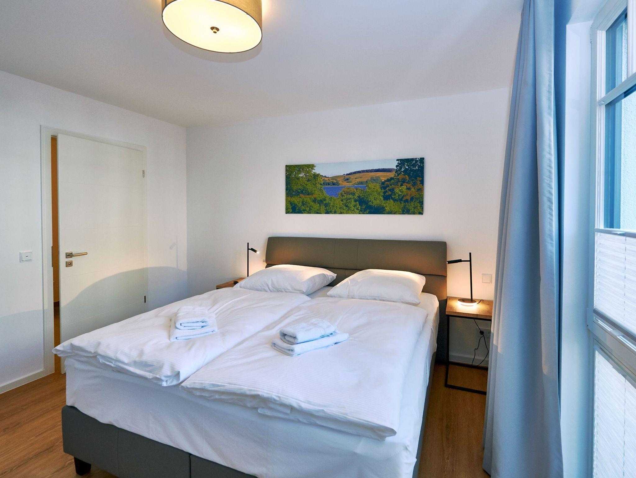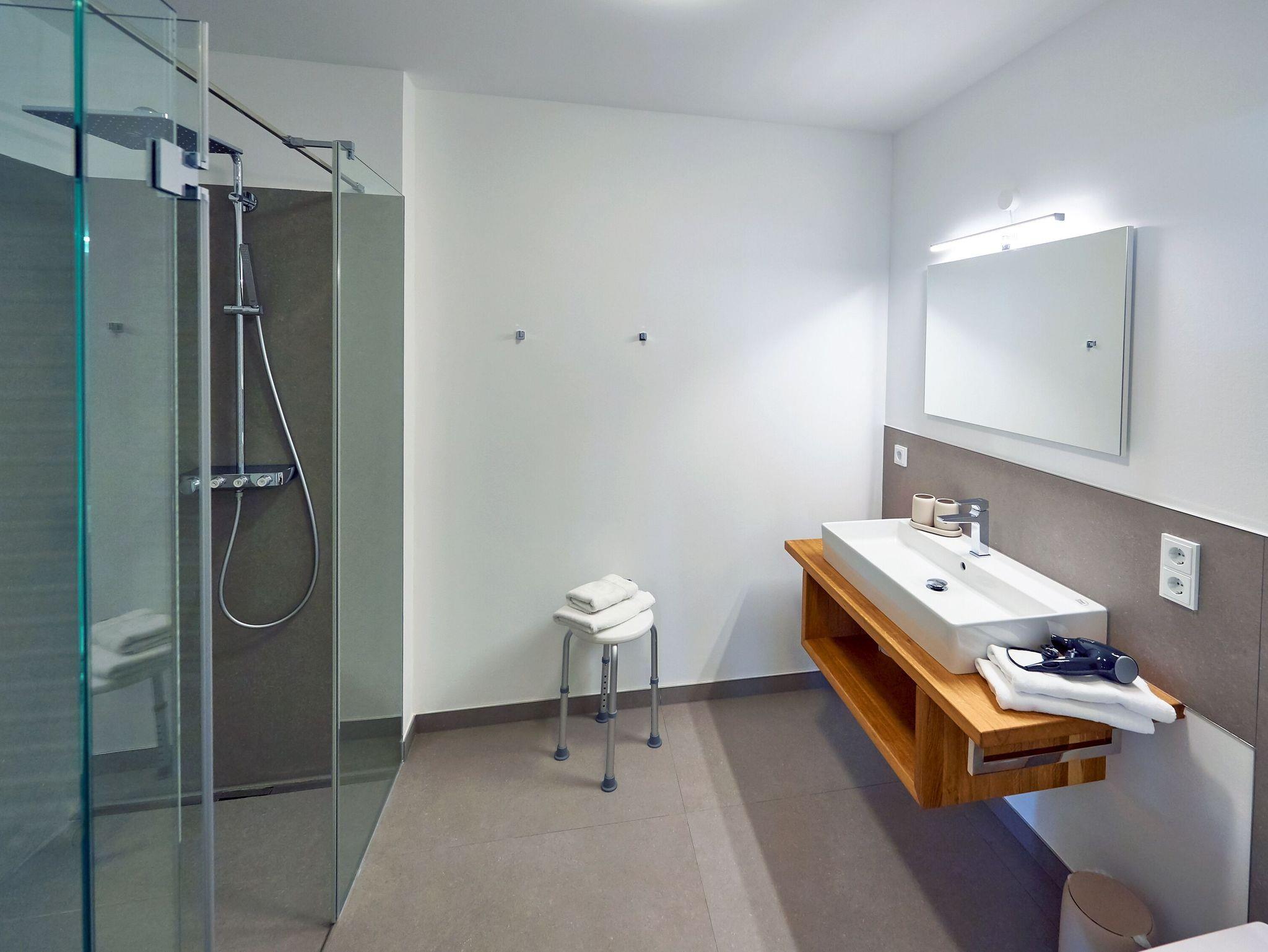 Die beiden Schlafzimmer sind mit überaus bequemen Boxspringbetten (1,80 x 2,00m), großzügigen Kleiderschränken für Ihre Urlaubsgaraderobe und zusätzlichen Fernsehgeräten ausgestattet. Jeweils angeschlossen ist ein eigenes Badezimmer mit bodentiefen Duschen, WC, beleuchtetem Waschtisch, Fön und beheizbarem Handtuchtrockner.