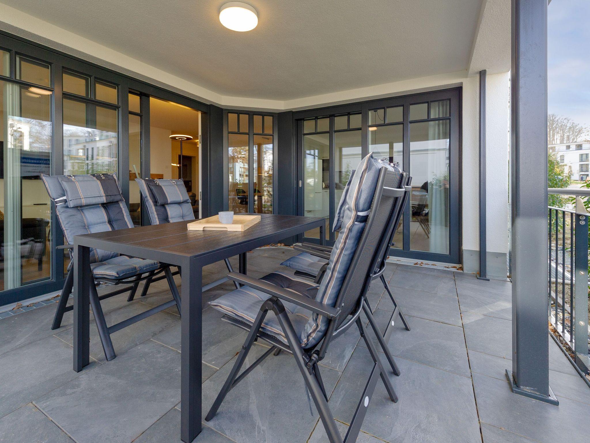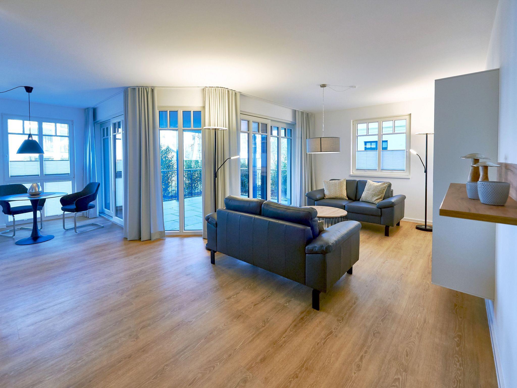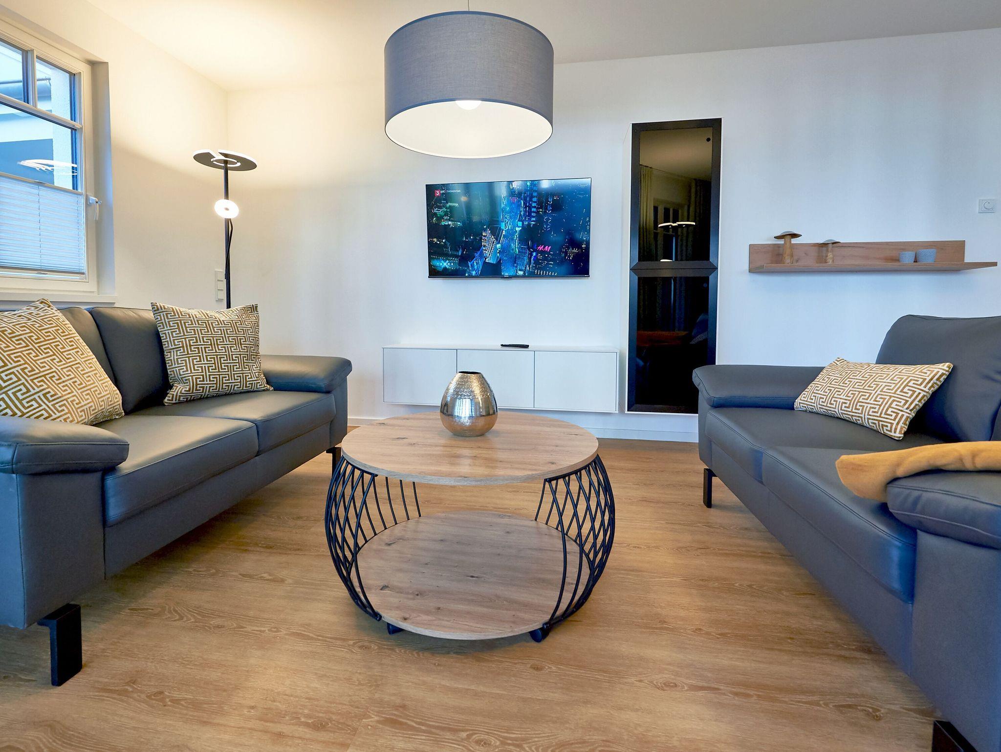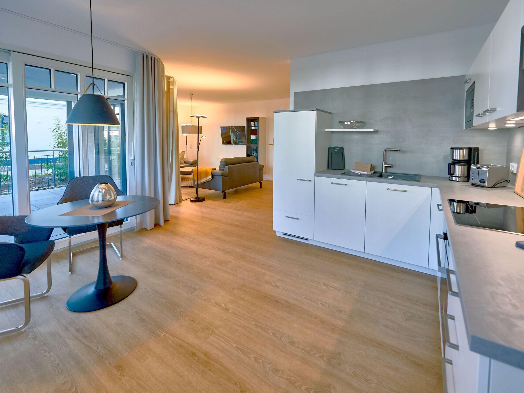 Herzstück Ihres Urlaubsdomizils ist das kombinierte Wohn- und Esszimmer mit offener Wohnküche. Der großzügig angelegte Raum mit einer bodentiefen Fensterfront zur überdachten Terrasse ist baulich geschickt in seine verschiedenen Funktionsbereiche unterteilt. Mehrere Decken- und Stehleuchten sorgen dafür, dass man immer das passende Licht am richtigen Ort hat - egal, ob man es sich gerade auf einer der Couchen vor dem großen Flatscreen-TV bequem macht oder mit der Familie am geräumigen Esstisch speisen möchte. Eine Fußbodenheizung garantiert in der gesamten Wohnung die passenden Raumtemperaturen, auch W-LAN ist flächendeckend vorhanden.