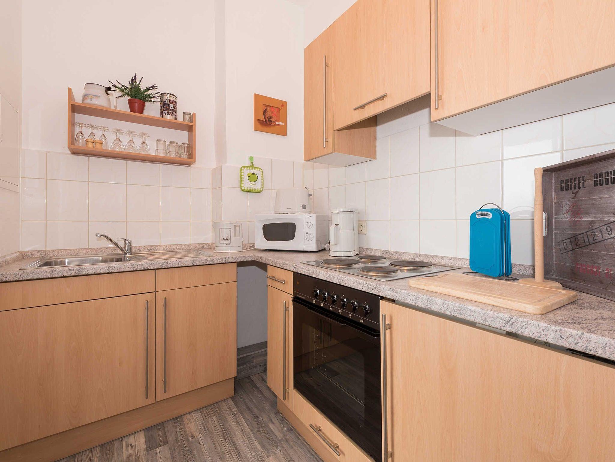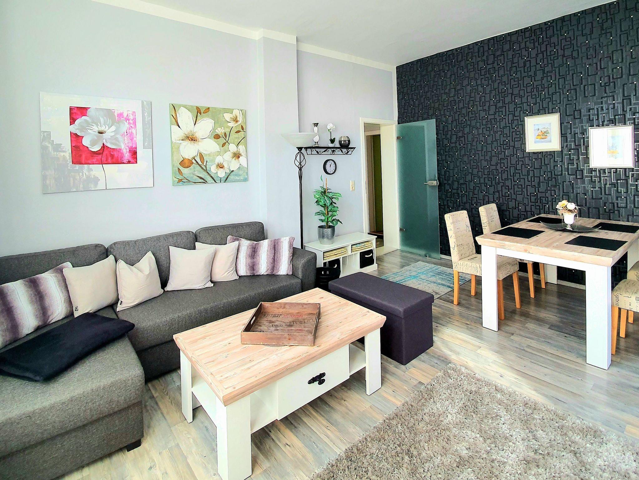 3-Raum-Ferienwohnung mit Balkon. 2 Schlafzimmer, ca. 78 qm, Du/WC, Nichtraucherwohnung, bis 4 Personen belegbar, sep. Küche , Essplatz im modernen Wohnzimmer. Beide Schlafzimmer verfügen über ein Doppelbett. Das Mitbringen von Haustieren ist nicht gestattet.