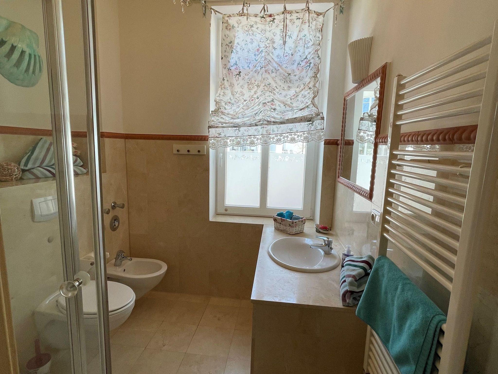 Marmor Duschbad mit BD, WC, Fenster und Fußbodenheizung.