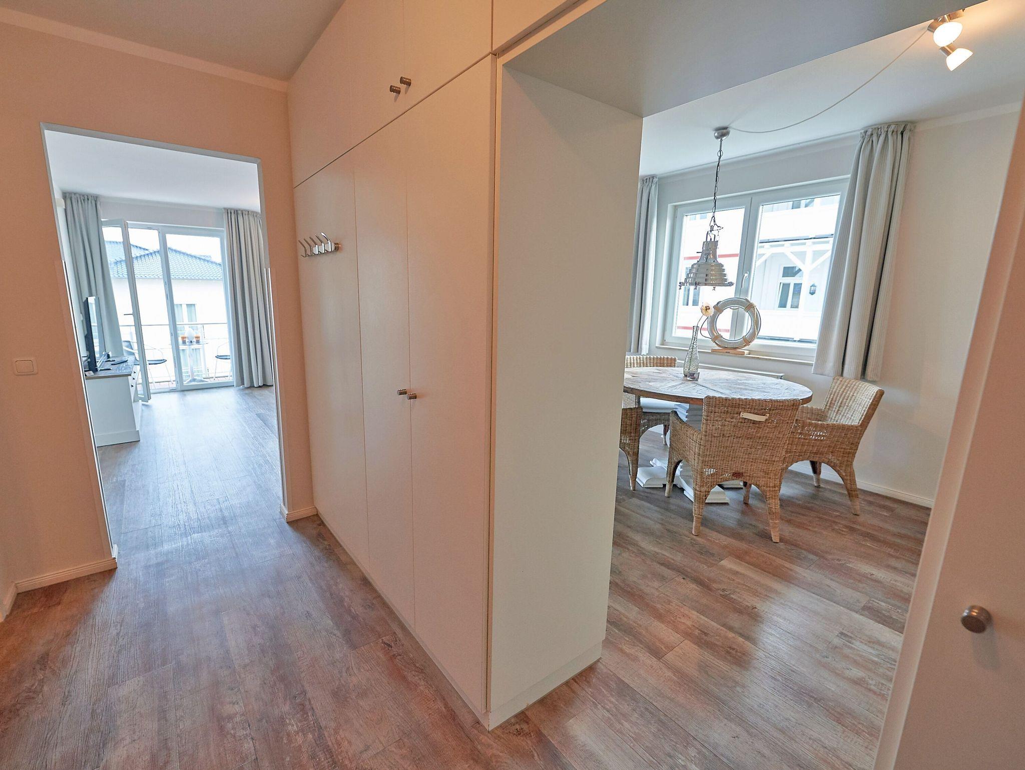 Der geräumige Flur, das großzügige Wohn-/Esszimmer und das Schlafzimmer sind mit einem modernen Vinylbelag in Holzoptik versehen, das Badezimmer ist gefliest. Trendige Holz- und Korbmöbel im Hampton-Style und vor allem der Balkon zur Seeseite, auf dem Sie in der Morgensonne frühstücken und den kleinen Meerblick genießen können, schaffen von Beginn an ein angenehmes Wohlfühlambiente.