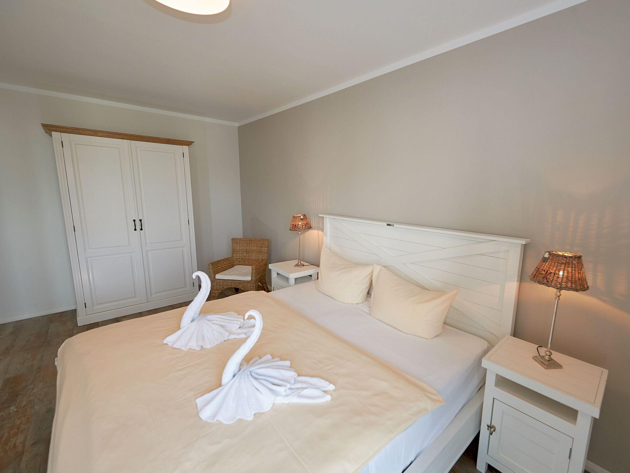 Während im Schlafzimmer mit seinem komfortablen Doppelbett (180 x 200 cm) ein großer Kleiderschrank das Stauraum-Angebot aus dem Flur ergänzt, überzeugt das schön geflieste Badezimmer mit einer geräumigen Dusche, einem beheizbaren Handtuchtrockner, einem beleuchteten Waschtisch sowie Fön und WC.