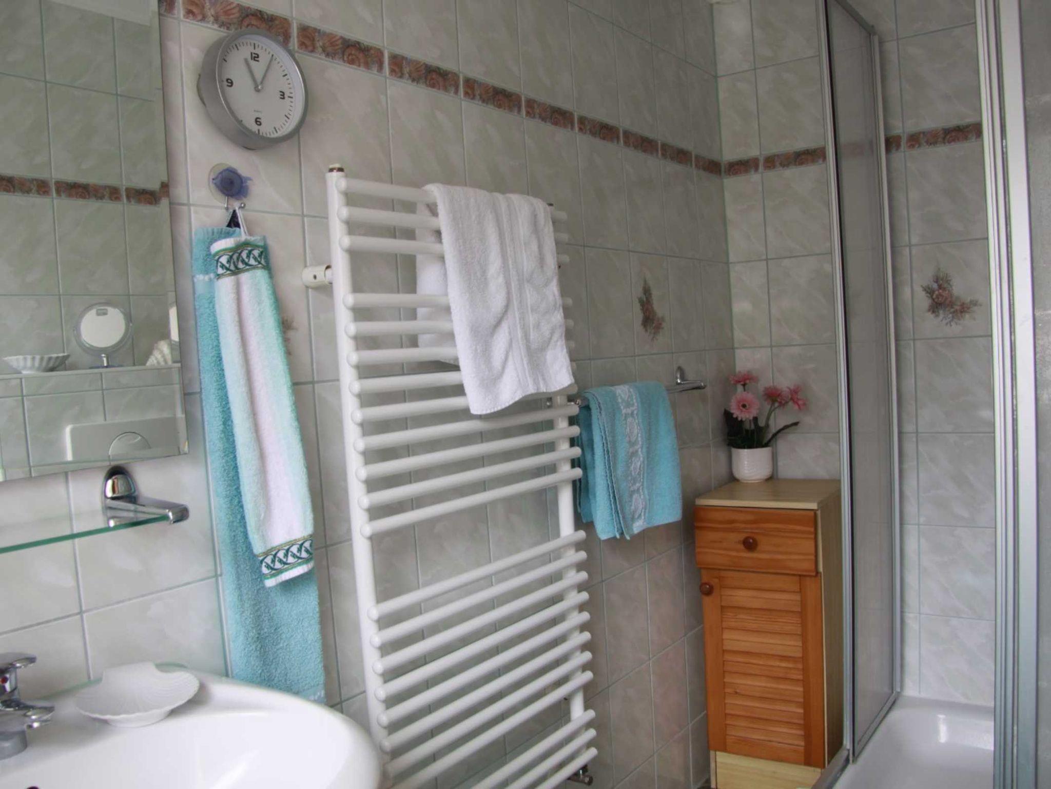 Das Badezimmer ist ausgestattet mit Waschtisch, Dusche und WC.