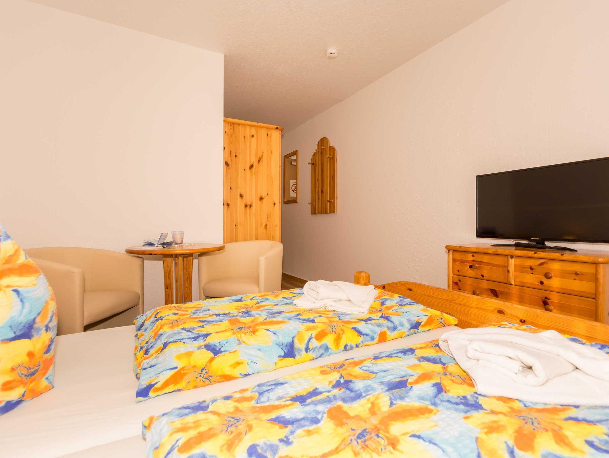 - Doppelzimmer (Standard) mit Doppelbett und kleiner Sitzecke, sowie Kabel-TV/Flachbildschirm, Bad mit Dusche und WC, sowie Haartrockner; WLan/Internetanschluss;