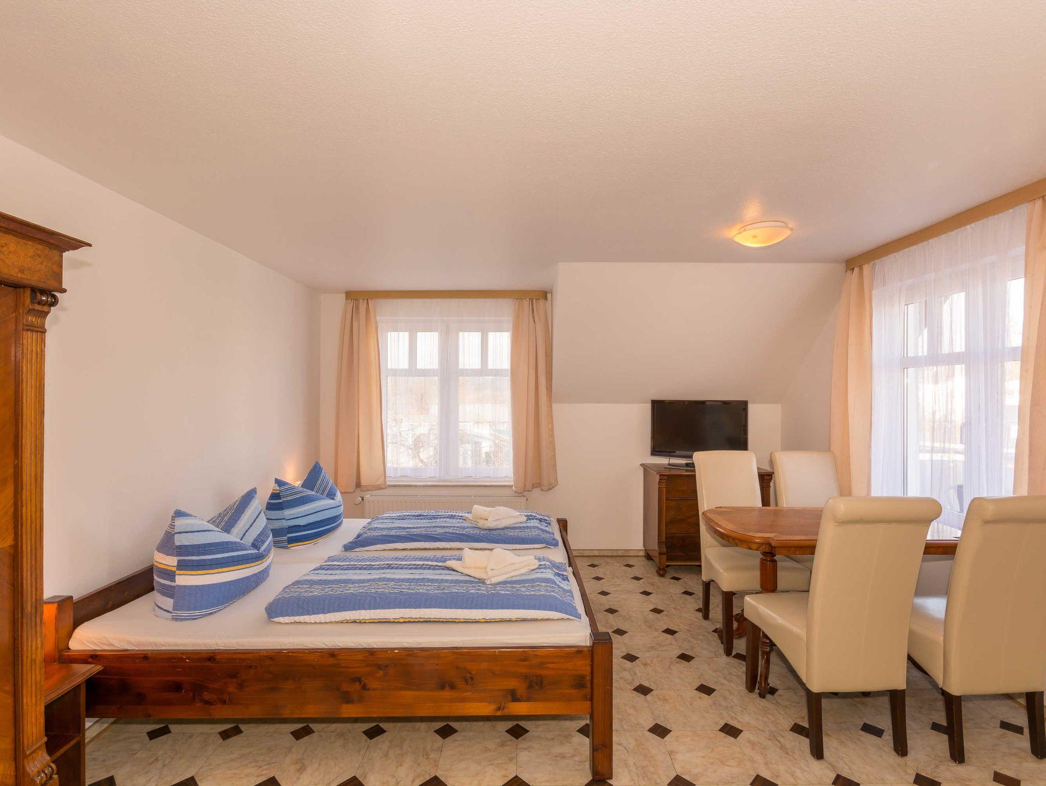 1-Zimmer Ferienwohnung: Kombiniertes Wohn- und Schlafappartement (2-4 Personen) mit Doppelbett und großer Sitzecke: Doppelbettcouch als Aufbettungsmöglichkeit (kein getrennter Schlafraum); Kuechenecke mit Herd, Kuehlschrank und Geschirr; Bad, Dusche und WC; Kabel-TV; ca. 50 qm;